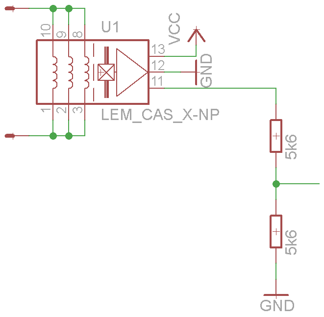 Hi, ich habe einen LEM CAS6-NP Sensor und möchte damit einen Strom messen. Pin 13 (VC) habe ich auf 5V gelegt, 12 (GND) auf GND und an Pin 11 hängen 2 5k6 Widerstände in Serie und dazwischen messe ich meine Spannung. Pin 1-3 und Pin 8-10 sind verbunden und dort fließt mein Strom durch (LEM Sensor ist in Serie geschalten). Nun messe ich aber, wenn nichts angeschlossen ist, zwischen den 2 Widerständen ~2V, vor den Widerständen ~4V. Sollten doch eigentlich 2.5V sein - 0A sind laut Datenblatt 2.5V. Was ist da falsch? Datasheet: http://www.lem.com/docs/products/cas%20series.pdf Gruß