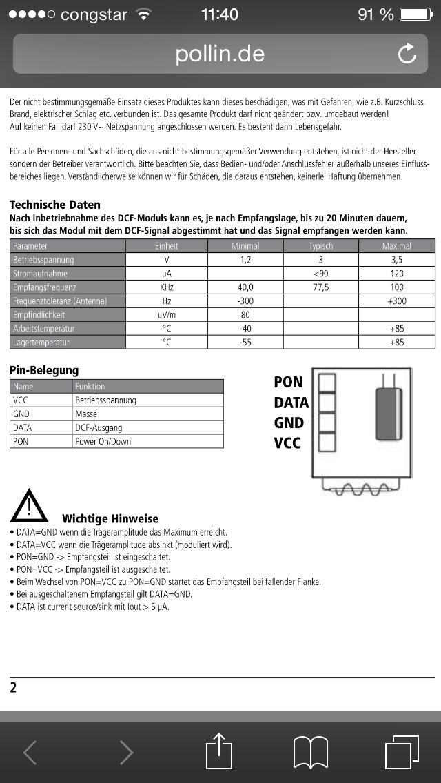 Hallo reg, der Ausgang meines Pollin-DCF-Empfängers durfte nur sehr gering belastet werden, ansonsten funktionierte er nicht. Mit der im Schaltbild unten links gezeigten Anschaltung klappte es dann einwadfrei: Beitrag "[Bascom/AVR] Uhr und DCF" Bitte beachten, die Schaltung invertiert das DCF-Signal. Gruß Alex