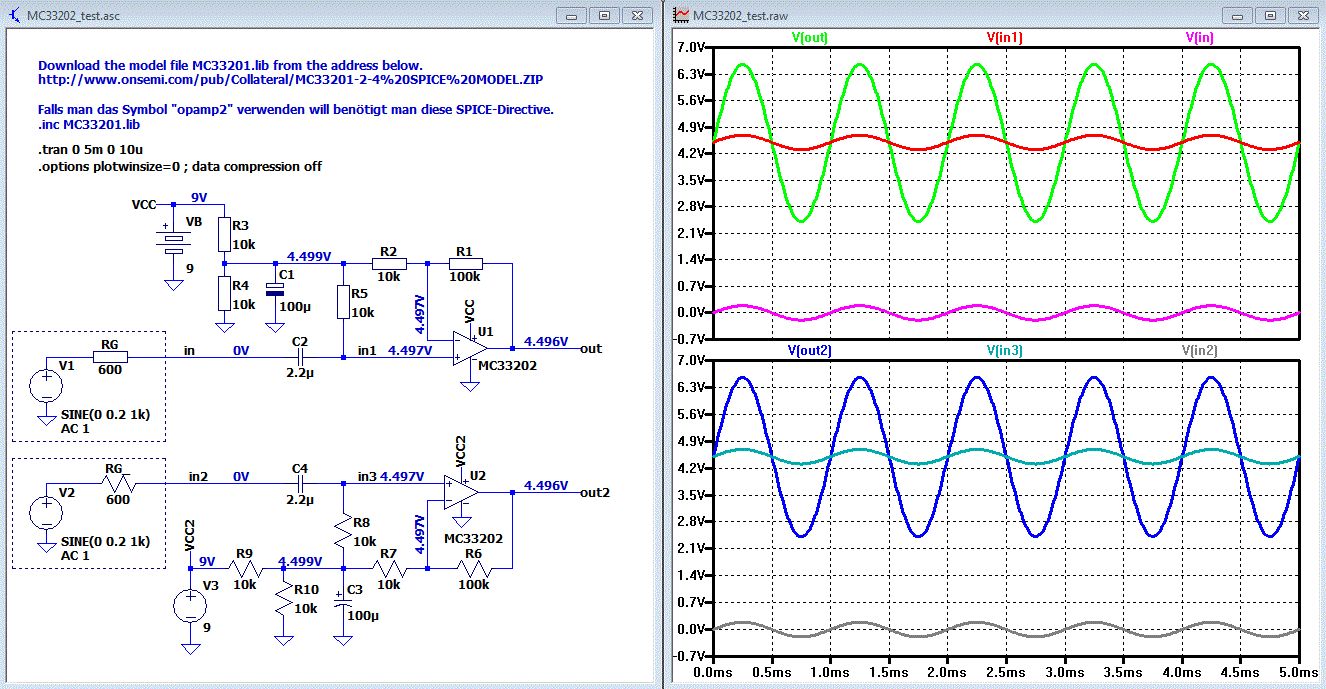 Hallo Michael, als erstes lädst du die das Modell herunter. Das ist meistens eine PSPICE Datei. Die dort verwendeten Elemente kennt LTspice praktisch alle. http://www.onsemi.com/pub/Collateral/MC33201-2-4%20SPICE%20MODEL.ZIP In dem zip-file ist eine Datei MC33201.lib. Da steckt das Modell (subcircuit) drin. Diese Datei enthält auch Kommentare die für die Einbindung des Modells wichtig sind. .SUBCKT ONSEMI_MC33201 1 2 3 4 5 * | | | | | * | | | | Output * | | | Negative Supply * | | Positive Supply * | Inverting Input * Non-inverting Input * * * The following op-amps are covered by this model: * MC33201, MC33202, MC33204, NCV33202, NCV33204 Die Pinreihenfolge "Non-inv. input, inv. input, .." stimmt mit der "Netlist order" der Pins des Symbols "opmap2" von LTspice überein. Man könnte somit direkt dieses Symbol "opamp2" nehmen. Im Schaltplan müsste man dann das "opamp2" durch "ONSEMI_MC33201" ersetzen. Alternativ könnte diese Zeile .SUBCKT ... ändern, damit der Name bequemer nur noch MC33202 heißt. Ich bin allerdings kein Fan von Änderungen im Modell. Die ganz andere Lösung erfordert ein eigens Symbol. Dort kann man MC33202 eintragen ohne die Modelldatei ändern zu müssen. Siehe mein angehängter zip-File. (Da habe ich als Beispiel auch europäische Symbole verwendet.) In der Modelldatei steht auch noch ein copyright Vermerk. Diese Firma AEI meint es aus eigener Erfahrung genau so. Deshalb habe ich die MC33201.lib nicht eingefügt. Bei allen anderen Firmen hatte ich nie Probleme, wenn ich deren Modelle in einem Beispiel in einem Forum hochgeladen habe. Lade den oben verlinkten zip-file herunter und extrahiere die MC33201.lib. Die kopierst du dann in das Verzeichnis deines Schaltplanes. * Users may not directly or indirectly re-sell or * re-distribute this model. This model may not * be used, modified, or altered * without the consent of AEi Systems. Noch ein Tipp. Lege für alle deine eigenen Designs ein Verzeichnis außerhalb C:\Pogram Files .. an. Generell kann man sehr viel mit dem Modell UniversalOpamp2 machen. Dort kann man mit Rechtsklick auf das Symbol dessen Parameter einstellen. Ich verwende sehr oft UniversalOpamp2 da man dort Bandbreite (GBW) und Anstiegsgeschwindigkeit Slew (rate) einstellen kann. Gruß Helmut Nachtrag Ich habe zwei Symbole gemacht. Eines mit dem Minuseingang oben und eines mit dem Minuseingang unten.