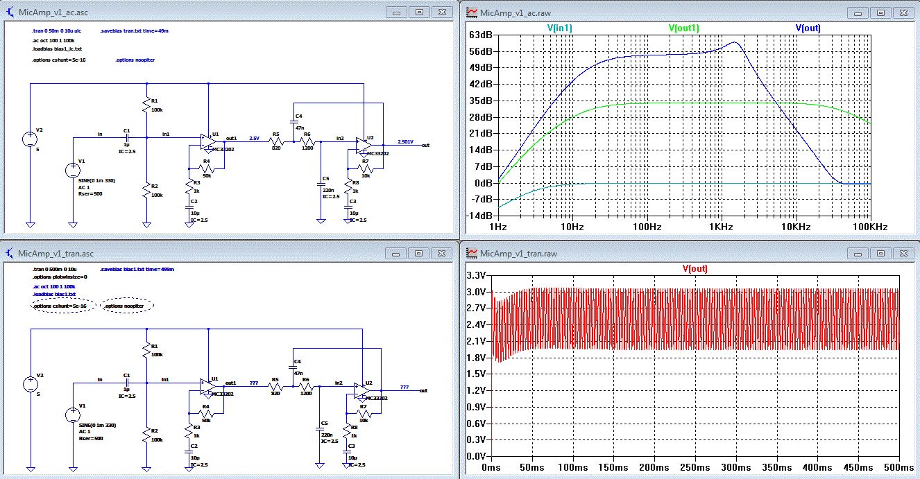 Hallo, leider hat auch der Opamp einige table() Funktionen. Zwar nicht so viele wie die Modelle von Microchip aber sie machen trotzdem jede Menge Konvergenzprobleme. Nach langem Suchen habe ich für .TRAN eine Lösung gefunden. Mit der Lösung habe ich dann einen Arbeitspunkt-File mit .savebias erzeugt den ich in der AC Analyse mit .loadbias einlese. .savbias erzeugt .nodeset SPICE-Zeile. Das .nodeset muss man dann mit einem Texteditor nach .ic umbenennen. .nodeset V(in)=-3.314826191e-009 V(n001)=5 V(in1)=2.493423778 V(n003)=2.493472923 .... --> .ic V(in)=-3.314826191e-009 V(n001)=5 V(in1)=2.493423778 V(n003)=2.493472923 .... Gruß Helmut PS: In deinem MicAmp.asc sind die Eingänge falsch(vertauscht) angeschlossen.