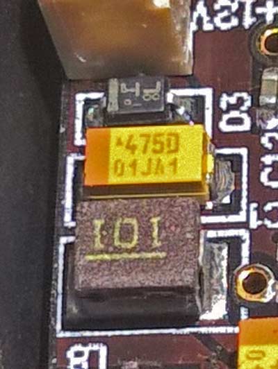 Diode: Ist kaum zu identifizieren. Bauform würde ich auf SOD123 schätzen Tantal-Elko: 475 sind definitiv 4.700.000pF = 4,7µF ! Die Spannung wird durch den nachfolgenden Buchstaben definieret. D = 20V kann gut sein - hab eben nichts zum Nachgucken hier. Induktivität: 101 sind definitiv 100µH ! Wie schon oben gesagt: Durch möglichst baugleiches Teil mit 100µH ersetzen.