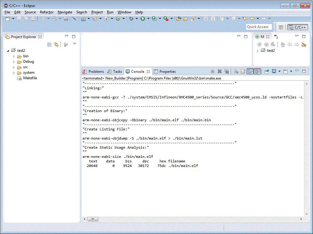 Hallo ! Ich möchte erstmals Eclipse für gcc-arm-none-eabi verwenden. Ich habe ein vorhandenes make File für ein projekt und kann dieses problemlos in einer cmd Shell übersetzen. Dieses Makefile will ich nun einfach aus Eclipse aus aufrufen. Ich verwende gnu make und habe den Pfad gesetzt. Ebenso habe ich für gcc-arm-none-eabi den Pfad gesetzt. Nun sehe ich, dass man unter den Projekteigenschaften "Builders" setzen kann: Hier gint es vordefinierte Builder "CTD Builder" sowie "Scanner Configuration Builder". Muss ich diese deaktivieren und stattdessen einen eigenen Eintrag erstellen? Es funktioniert eigentlich, nur bekomme ich einen Fehler bei "Problems", denm ich mir nicht erklären kann: Wieso will der Übersetzer g++ bzw. gcc verwenden? Das kommt in meinem Makefile nirgends vor? Wo trete ich mir das ein? Danke und Grüße, Michael