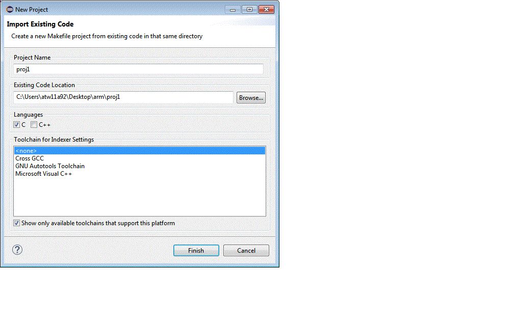 Ich denke ich habe es hingebracht. Der Haken ist, dass ich nicht weiß, was ich eigentlich tue - und das mag ich gar nicht... Beim Anlegen des Projekts gibt es gleich am Angang eine Auswahl wie im Bild. Ich habe augewählt: "None", da ja das make und die darin aufgerufene Toolchain (der arm-gcc compiler) am PC als Programm installiert ist. Was würde es bedeuten, hier z.B. "Cross GCC" auszuwählen? Ich habe das prinzipielle Problem, das Konzept von Eclipse nicht zu verstehen: Einerseits ist eine ganze Menge irgendwie vordefiniert, andererseits steht hinter dem Aufruf eines Compilers doch nur ein Executable. Wie mache ich das "richtig", wenn ich ein vorhandenes make + Makefile verwenden will ?