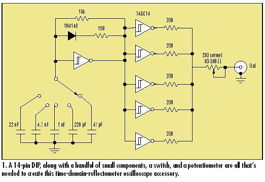 >Es ist die Schaltung eines Kabeltesters, eines "poor mans time domain reflectometer" im passenden Artikel kurz "cabel radar" genannt. Erstens benoetigt man dazu keine 5V, das ist voellig uebertrieben. Und zweitens sollte man auf kurze Pulse schauen, also kein TTL Zeug, sondern was Schnelles, zB ECL. Das macht auch 800mV Hub, und ist vollauf genuegend. Mit 10MHz kann man nur 15m Kabel betrachten... Nimm 1MHz. Dann einen ECL Line Receiver dran, zB ein '16 und wenn man besonders voel Amplitude hinten haben will, optional einen '89, dh MC100EP89, oder SY100EP89