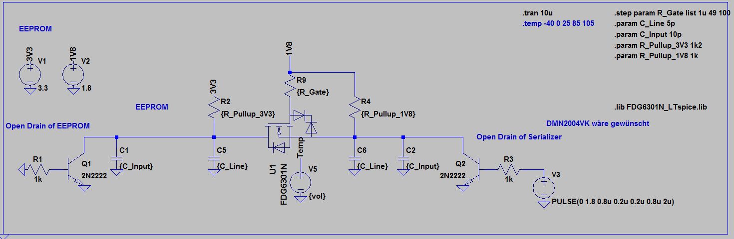 Hallo zusammen Ich brauche einen I2C-Levelshifter von 1,8V auf 3,3V. Deswegen habe ich mir die AN10441 von NXP angeschaut und wollte das auch in meiner Schaltung verwenden. Die Simulation funktioniert. Wenn ich manuell die Signale wackel gehts auch. Nur wenn ich das mit Aardvark versuche (Geschwindigkeit 400kBit/s) funktionierts nicht. Ich bekomme ganz schön heftige Delays. Simulation ist angehängt: Pullup 1,8V = 1k Pullup 3,3V = 1,2k Zur Auswahl des FET: V_GS_threshold << 1,8V damit er sauber durchschaltet Wer kann mir Tipps geben an was es liegt? Viele Grüße Entwickler
