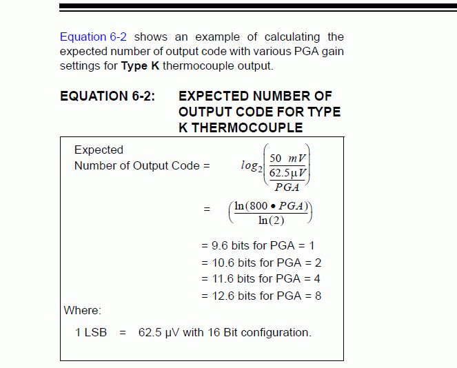 Martin Michael schrieb: > Frage 2. > Ich verstehe nicht die 9,6 bits > Expected Number of Output Code = 9,6 bits for Power Gain = 1 etc. Wenn man ein Thermoelement Typ K (full scale Ausgansspannung 50mV @1250°C) an den ADC hängt, das wird effektiv die Angegeben Auslösung erreicht. Der ADC wird dir immer noch die 16bit liefern, daraus kann man die Temperatur aber nur mit der angegeben Auflösung berechnen.