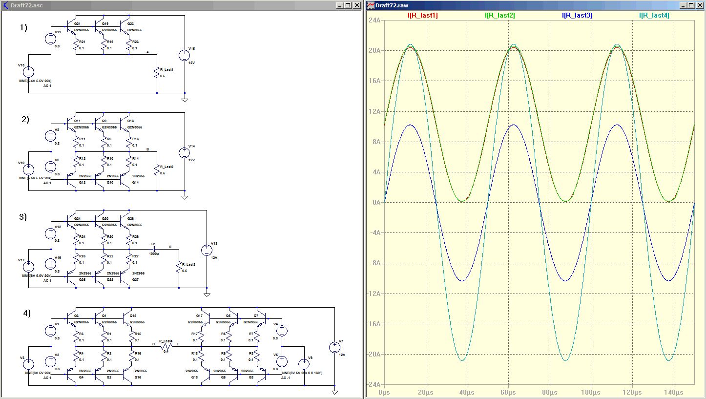 Schaltbeispiele: 1) Einseitige Spannung, Last muss Spannung zurückstellen 0-11V, 0-20A 2) Einseitige Spannung, Last muss sich mechanisch zurückstellen 0-11V, 0-20A 3) Galvanisch getrennt, dadurch symetrische Spannung +5,5...-5,5V, +/- 10A 4) Brückenschaltung +/-11 Volt, +/- 20A Es empfiehlt sich, für die Treiber eine Spannung von mindestens +18V und -5V zu erzeugen, damit die Endstufe richtig durchgesteuert werden kann. Emittterfolger sind sehr pflegeleicht bezüglich Schwingen. Beispiel eines NF-Verstärkers mit parallelgeschalteten Endstufen-transistoren, um eine Vorstellung vom Schaltungsaufwand zu bekommen: http://home.arcor.de/bacardi-tenzer/Endstufe/stufe_12.jpg