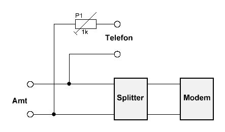die gezeichnete Variante habe ich mal in Frankreich gesehen. Die hatten einen Hochpassfilter in der Leitung zum Modem, aber auch einen Tiefpass in der Leitung zum Telefon. Also quasi einen Splitter in zwei Gehaeusen aufgeteilt. Da variiert es dann auch je nach Intelligenz des Kunden, ob und wo in welcher Leitung jeweils ein Filter eingebaut ist. Kann es sein, dass die Stelle, an der Du den Abzweig des Telefons hingemalt hast in Wirklichkeit die erste TAE-Dose (Uebergabepunkt vom Amt) ist? Wenn ja, dann erklaert sich das Verhalten dadurch, dass die Telefonleitung an dieser Stelle eben NICHT einfach parallel geschaltet ist. Eine richtig angeschlossene TAE-Dose in Verbindung mit einem richtig funktionierenden Telefon sorgt dafuer, dass die nachfolgenden Geraete beim Gespraech mit dem Telefon abgetrennt werden. Viele Billigtelefone machen das allerdings nicht, sondern lassen die nachfolgenden Geraete einfach parallel an der Leitung. Das neue Gigaset macht das jetzt moeglicherweise nicht mehr.