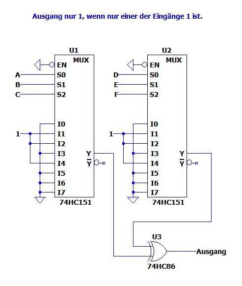 Man kann die beiden Multiplexer schon benutzen, braucht aber dann noch ein 3-fach-OR, um für einen von beiden die Fälle A+B+C=0 und A+B+C>1 zu unterscheiden. Edit: Peter Dannegger schrieb: > Ein dreifach-NOR (74HC10) von 9,10,11 des ersten an 1,14,15 des zweiten. Ja, so ungefährr sollte es gehen, auch wenn ich's jetzt nicht durchgespielt habe.
