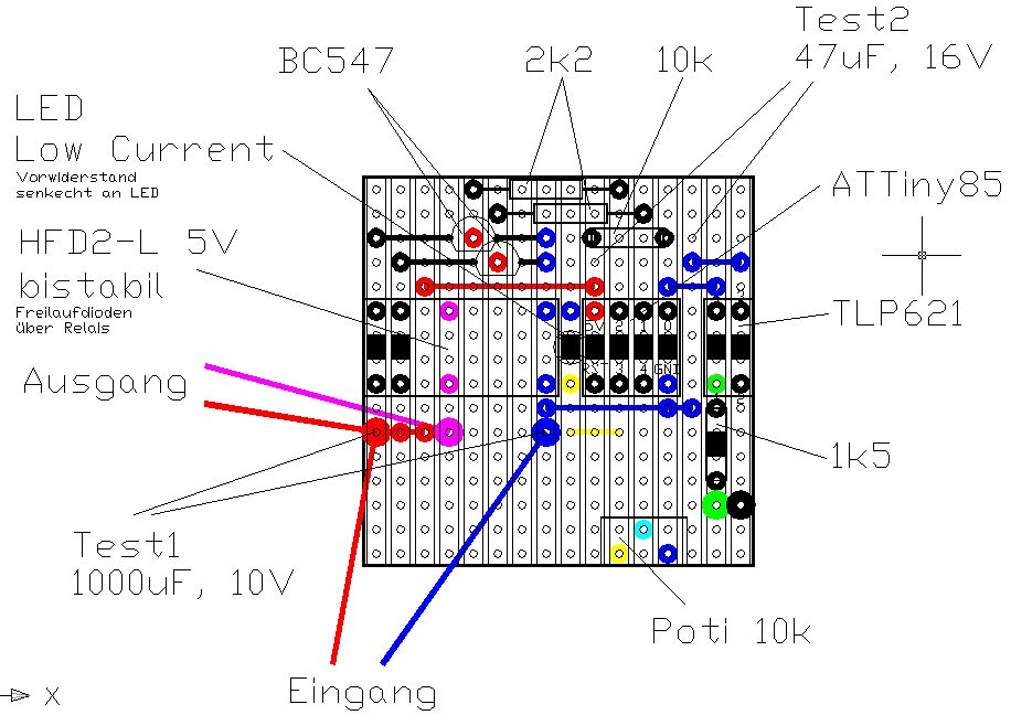 Danke für die Antwort - Optokoppler funktioniert mit 1k5 einwandfrei. Allerdings neues Problem: solange am Ausgang nur eine LED angeschlossen ist, funktioniert die ganze Schaltung tadellos. Wenn ich aber den Music Player anschliesse und Pin2 auf HIGH geht, führt der Mikrocontroller einen Reset durch. Vermute, dass der Music Player beim Einschalten zuviel Leistung benötigt und habe - ohne wirklich zu wissen was ich tue - mit Kondensatoren experimentiert (s. Anhang). Der 1000uF direkt am Platineneingang schafft Abhilfe, der 47uF am Mikrocontrollereingang schafft Besserung. Bin ich mit den Kondensatoren auf dem richtigen Weg und falls ja, wo ist die korrekte Einbauposition? An dieser Stelle möchte ich mich selbst von weiter oben zitieren Matthias schrieb: > ... und da ich gerade beginne, mich mit > Elektronik / Mikrocontrollern zu beschäftigen! Das ist auch der Grund, warum ich nicht mit einem professionellen Schaltplan dienen kann Danke für alle Anzworten Matthias