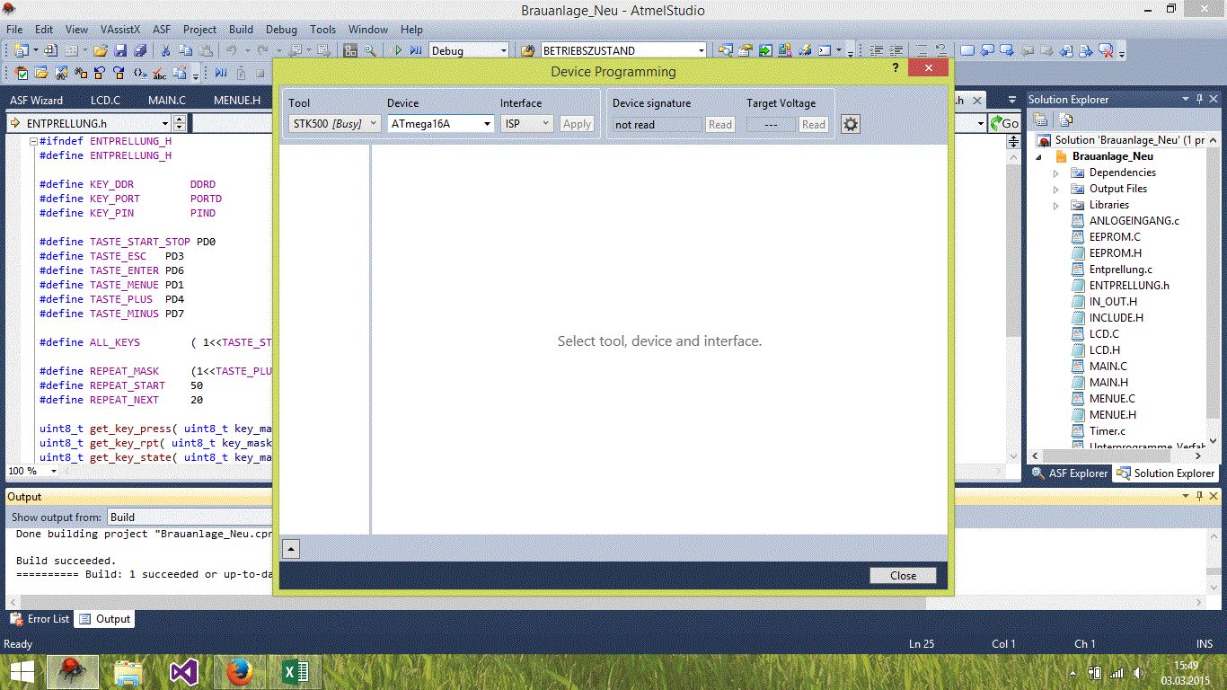 Hallo, ich habe folgendes Problem: Ich Compiliere im Atmel Studio 6 ein Programm und schicke dieses über einen USB-Delock-Rs232 Wandler zum meinen STK500. Dieses sendet es weiter über ISP zu meiner Platine. Es hat immer alles super Funktioniert. Aber jetzt muss ich immer mein Studio neu starten, um nochmal programmieren zu können, weil der das Stk500 anscheinend "busy" ist und ich mich nicht dem Stk500 verbinden. (sh. Bild im Anhang) Nach dem Neustart des Studios kann ich wieder programmieren! Wie kann ich ohne Neustart immer programmieren, denn dass frisst einfach zuviel Zeit. Mit freundlich Grüßen stiefei