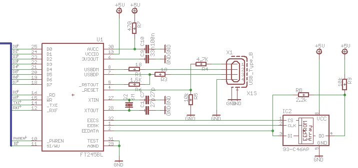 Nachtrag: mir fiel gerade auf, dass deine USB-Leitungen ja gar keine Masse auf der gegenüberliegenden Platinenseite haben. Damit hast du eine schöne Fehlanpassung der Leitungen ... und eine weitere Fehlerquelle... Auch wenn es nur ein 12MBit/s Device ist, so sollte man trotzdem darauf achten. Nachtrag zum Nachtrag: das hilft dir hier jetzt nicht wirklich. Aber der FT245RL ist dank integriertem EEPROM und nicht benöigten Widerständen in den USB-Leitungen deutlich anwenderfreundlicher und auch von FTDI als Alternative zum FT245BL empfohlen