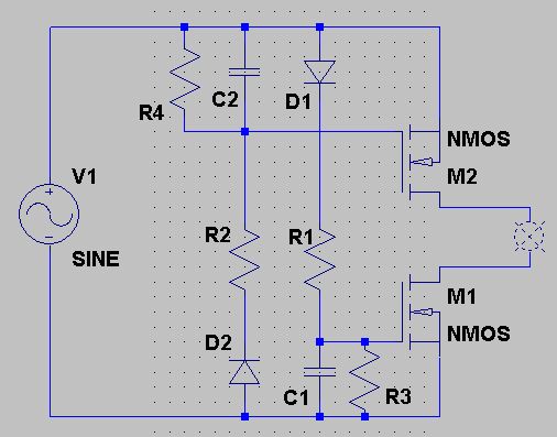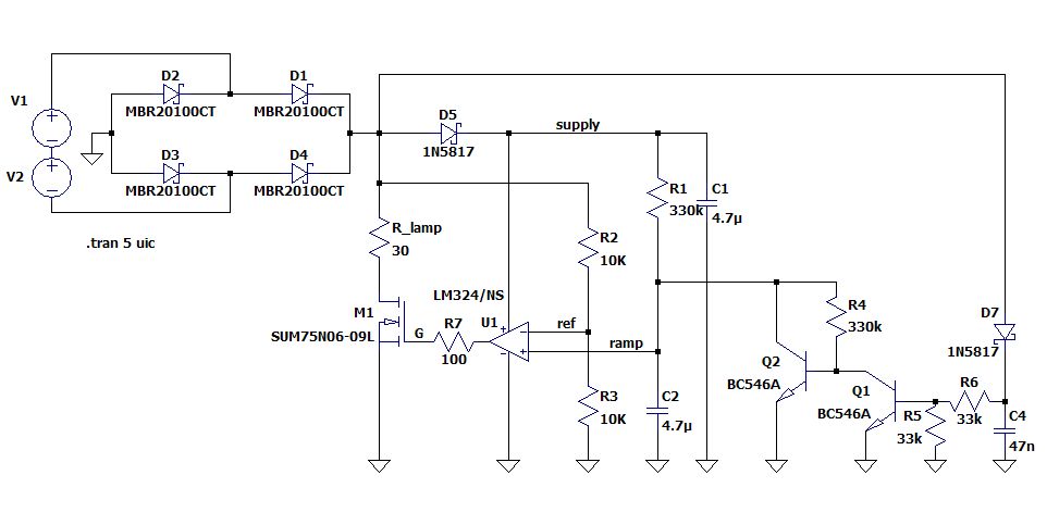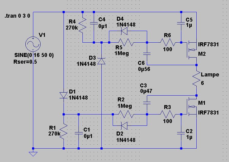 Hallo Ferdinand, die Mail ist raus. Melde dich kurz, wenn du sie bekommen hast. Habe noch etwas vergessen. Klemme 1 ist der Eingang vom Trafo, Klemme 2 ist der Ausgang zum Birnchen. Und falls du mit SwicherCAD ungehen kannst, kannst du die Schaltung damit simulieren und deinen Umständen anpassen. Gruß. Tom