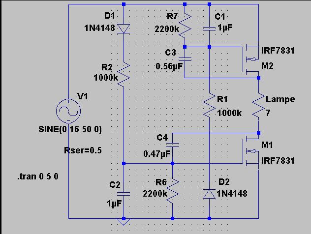 Also zwei Möglichkeiten gibts die Simulation mit dem Krucker-Modell zum Laufen zu bringen: 1. Den Gleichrichter durch einen mathematischen ersetzen: V=abs(Vin) 2. Im Lampen-Modell den Polynom kappen. Habe dazu den letzten Teil auskommentiert. Das reduziert den notwendigen Numerikrange. Schön ist das alles nicht. Würde mich interessieren, ob andere SPICE-Dialekte da keine Probleme machen. Wer probierts in TINA, Simetrix und wie sie alle heißen? Kurioserweise kann man auch eine kleine Induktivität in die Source des MOSFET einbauen. Bei passendem Wert rennt LTspice dann auch durch. Warum weiß ich nicht.