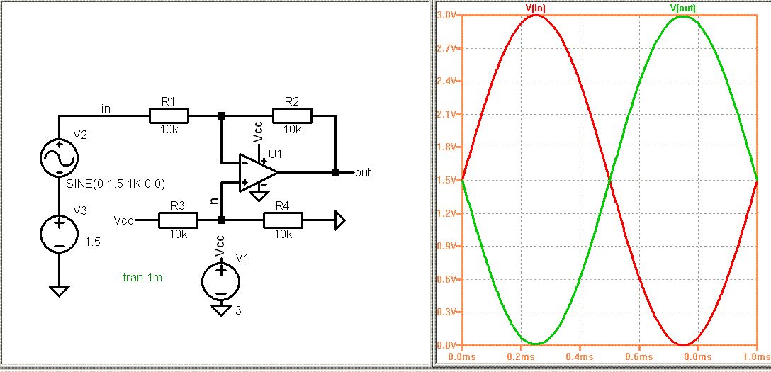 Hallo Tom, der Ansatz ist schon Richtig. Wenn du den nichtinvertierenden Eingang auf Vcc/2 legst (also Schleifer des Poti auf Vcc stellst), erhältst du theoretisch einen Eingangsbereich von 0 bis Vcc und ein Ausgangsbereich von Vcc bis 0. Mit R3 = R4 Uout=0,5*Vcc-Uin*R2/R1 Der Haken ist der OP-Ausgang: Er muss Rai-to-Rail können und das bedeutet dann in der Praxis auch nicht ganz von Vcc bis 0, sondern da fehlen dann meist noch einige 10mV nach oben undnach unten. Insbesondere wird der Bereich durch Belastung des Ausgangs weiter eingeschränkt. Daher würde ich die Widerstände eher auf 10k bis 100k dimensionieren. Je nachdem, wie hoch deine Signalfrequenz wirklich ist. Was brauchst du denn? Bis auf einige 10mV über Null geht auch bei einstelligen MHz mit dem passenden OP. Der Eingang muss übrigens kein Rail-To-Rail sein, denn das Potenzial am invertierenden Eingang folgt dem am nichtinvertieren Eingang und das ist ja Vcc/2. Grüße Martin