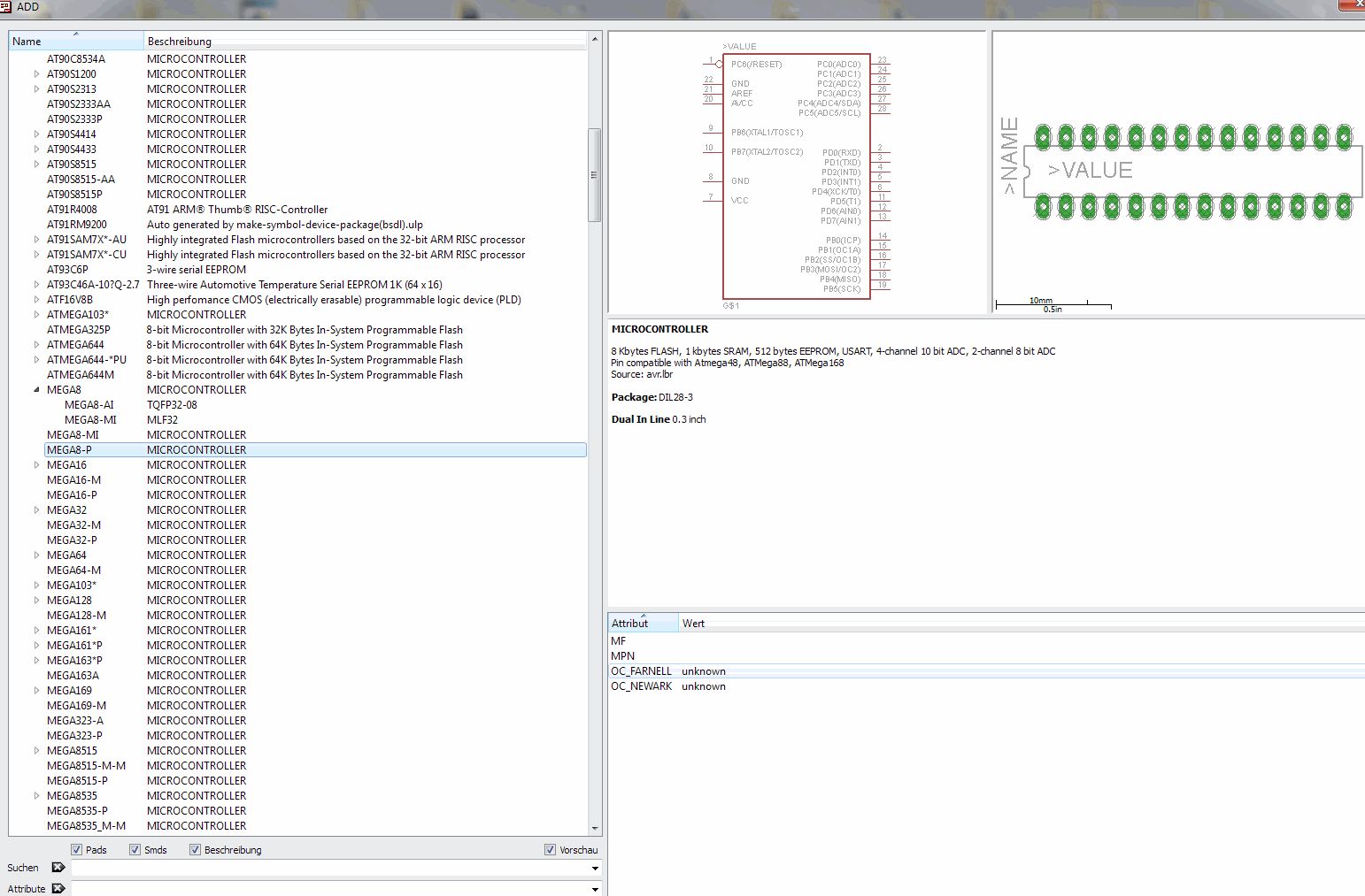 Du kannst natürlich auch aus den vielen vorhandenen Atmels im EAGLE die passende auswählen. Unter anderem auch den Mega8 (siehe Bild).