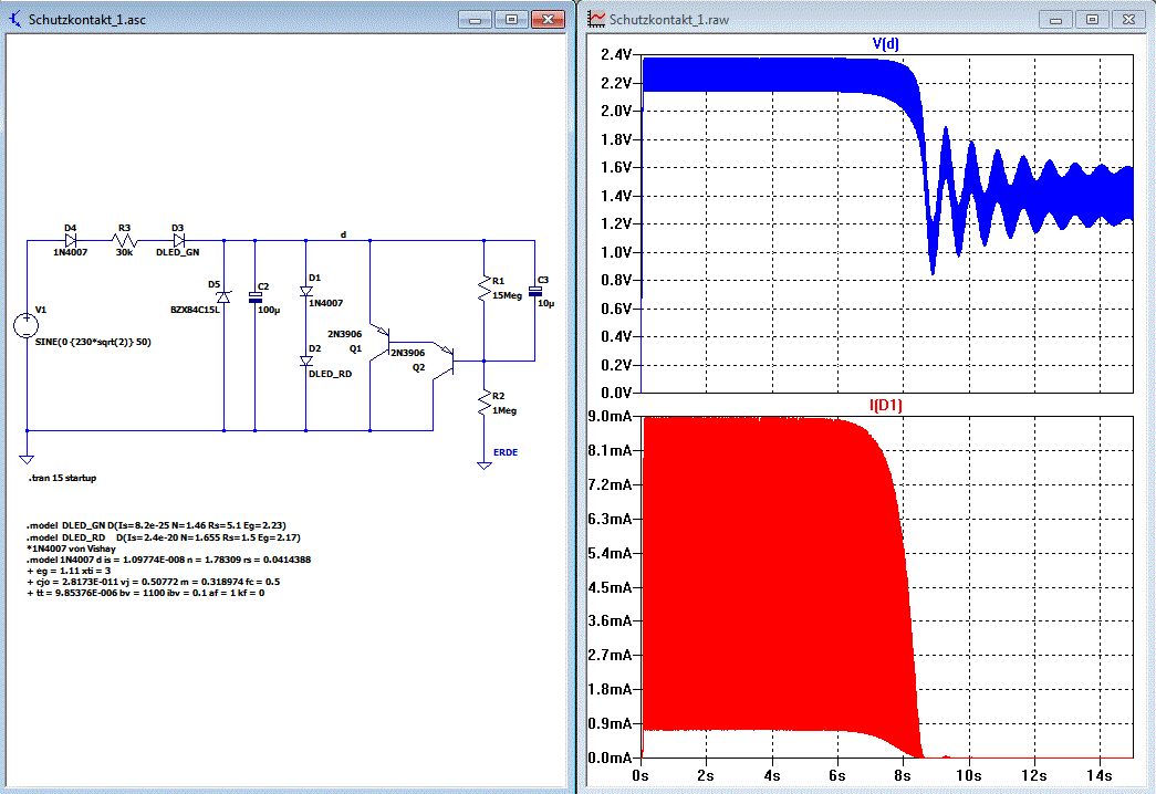 Hallo Thomas, ja du liegst richtig. Die Schaltung soll angeben, ob der Schutzleiter richtig angeschlossen ist (das hab ich ganz vergessen zu erwähnen). Nach deinem Kommentar nehme ich mal an, dass ich das in LTSpice richtig gemacht hab und die Erde mit Potential zu GND genommen habe. Was ich aber nicht verstehe. Wie erlischt die rote LED jetzt? Es ist ja offensichtlich, dass wenn der Schutzleiter richtig angeschlossen ist (im Bild mit Erde bezeichnet), sich aus der Schaltung die Transistoren irgendwie schalten müssen. Leider bekomm ich mit LTSpice und dieser Schaltung überhaupt kein Durchgang an den Transistoren, somit erlischt mir auch die rote LED nicht und ich hab dort (auch nach 120s Simulation) noch ca. 2V anliegen. Das mit der Zener könnte sein, aber der Elko kann nur heiß werden wenn er ständig entladen und geladen wird und das mit etwas höheren Strömen oder? Wenn D2 (Rote LED) hinüber wäre, und die Transistoren schalten, dann dürfte doch am ELKO nichts mehr abfallen und somit auch nicht heiß werden. Wie gesagt, mir gehts jetzt primär um die Schaltung der Transistoren. Ich habs noch nicht raus :/ Danke jedoch für deine Rückmeldung (bist auch noch lang wach). Grüße Tobi