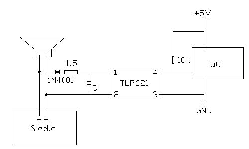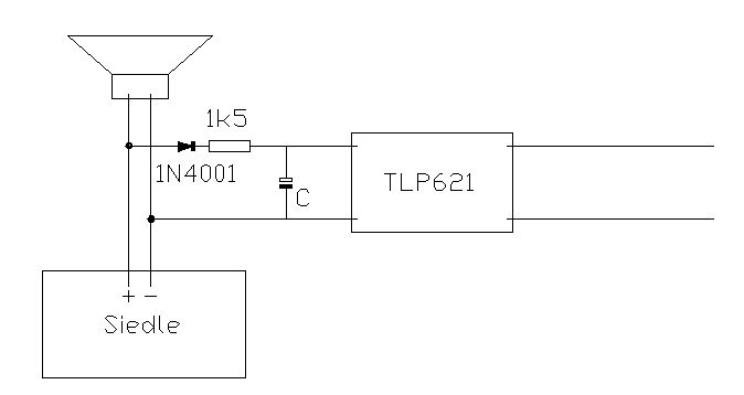 ok ;-) dann... genau so. Matthias schrieb: > An den 2 Pins liegen bei Ruhe 0V und beim Klingeln knapp über 4V > (gemessen mit Multimeter) an. Lautsprecher anzapfen und am 'Ende der Leitung' (Länge, Querschnitt, Qualität der Leitung weiß man auch nicht...) Spannung beim Klingeln messen. Liegen da angeblich die +/- 4V (Spannungsabfall...) an, dann dürfte das mit einem kleinen Brückengleichrichter (vielleicht DF02), einem geeigneten Widerstand (damit der Optokoppler gerade noch zuverlässig durchschaltet) und Optokoppler kein Problem sein. Brückengleichrichter, R und Opto. kürzester Weg, am besten auf PCB der µC-Schaltung. Wobei mir 4V ziemlich viel erscheinen.