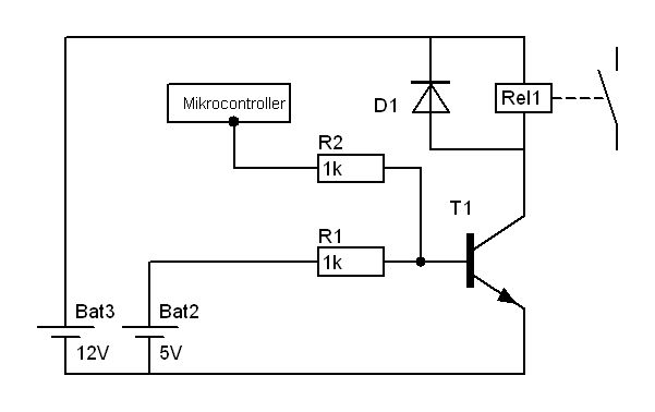 @TravelRec. Ich würd's auch so machen. @All Wozu die 5V?? Ist doch klar, dass der Transistor durchschaltet. Vom der 5V Quelle fließt genügend Strom zur Basis, damit der Transistor durchschaltet. Es reicht aus, die beiden Massen der Versorgungspannungen zu verbinden. Noch ein kleiner Tipp zu der Freilaufdiode. Es ist besser, eine Z - Diode (z.B. 20V) parallel zu schalten. Nur mal so aus Interesse, Stephan, du sprachst von einem Studienprojekt... Hoffentlich kein Elektrotechnik - Studienprojekt... Grüße