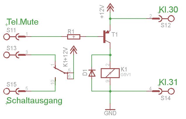 Hallo, ich hoffe das ihr mir weiterhelfen könnt. Es geht um meine HiFi Anlage in einem A4. Ich habe dort das große Navi RNS-E und eine originale Freisprecheinrichtung (FSE) drin. Am Navi ist einen Alpine DSP anheschlossen. Am DSP hängen drei Endstufen. Der DSP hat eine Verarbeitungszeit von ca. 40ms! An sich kein Problem, nur beim Telefonieren über die FSE sieht es anders aus. Jeder Gesprächsteilnehmer hört ein schönes Echo! Das nervt einfach nur noch und ich möchte dies abstellen. Das Navi hat ein Tel-Mute Ausgang. Das Tel-Mute Signal ist ein 12V Signal welches vom Telefonsteuergerät auf Masse gezogen wird, wenn ein Telefonat geführt wird. Wenn dies geschieht, schaltet das Navi intern auf den Telefon Eingang um. Der Strom des Tel-Mute Signals ist aber begrenzt (bei einem alten VW Navi waren es 1,9 mA). Ich möchte nun dieses Signal nutzen um einen Audioumschalter bzw. eine Relaisschaltung damit zu steuern. Der Umschalter soll das Audio Signal vom DSP trennen und direkt auf die Endstufen geben. Da das Tel-Mute Signal ein Relais nicht schalten kann, welches weitere Relais schaltet, geht es wohl nur mit einem Transistor o. ä. Eine Schaltung mit nur einem Transistor (npn) halte ich persönlich für keine gute Idee, da die Masse (auch die vom Relais) ja vom Telefonsteuergerät geschaltet werden muss. Ich habe dieses Forum auch schon ein bisschen durchforstet. Eine Lösung für mein "Problem" konnte ich leider nicht finden. Im Anhang findet ihr meinen laienhaften Versuch einer solchen Schaltung. Wie könnte nun so eine Schaltung aussehen? Vielen Dank im Voraus!!