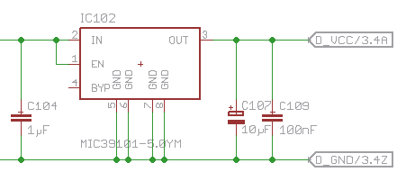Danke für die Antwort. Ja ich habe das Datenblatt gelesen. Aber vielleicht habe ich irgendwas übersehen. Deshalb frage ich ja hier nach Hilfe. Im Anhang habe ich mal den Schaltplan vom Regler angehängt. Der Kondensator C107 ist ein 10µF Tantal (TCJA106M016R0200) Dieser hat ESR 200 mΩ. Laut Datenblatt braucht der MIC39101 mindestens 10µF mit ESR < 2 Ω. Mit meinem 200 mΩ habe ich also gerade mal 10%. An die Kühlung über die Ground Terminals habe ich auch gedacht. Daran ist ein Kühlblech befestigt mit ca. 80x10 mm Fläche. Das sollte doch langen um die Wärme anzuführen. Ausserdem ist er ja mit nur 2 Sensoren noch nichtmal lauwarm und mit 3 Sensoren wird er schlagartig heiss. Dann schaltet er ab und wieder an im Takt von ca. 0,5 Sekunden. In diesem Moment messe ich komischerweise 1,7A. bei 2 Sensoren sind es nur 150µA.