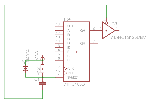 Hi, ich will einen 74xx165 SPI Kompatibel betreiben, da noch eine SD Karte und andere Sachen am SPI hängen. Hierfür kommt an den Q ein 74xx1G125. Da mir jedoch die Steuerleitungen knapp werden, würde ich das 165 und den 125 gerne mit nur einem Signal steuern. Meine Idee war ein Monoflop an PL, dass durch den Low Level am 125er gesteuert wird. Da ich keinen Platz für die zusätzlichen Bauteile bei einem NE555 z.B. habe, würde ich es gerne wie im Bild gezeigt realisieren. Kann das zuverlässig funktionieren?