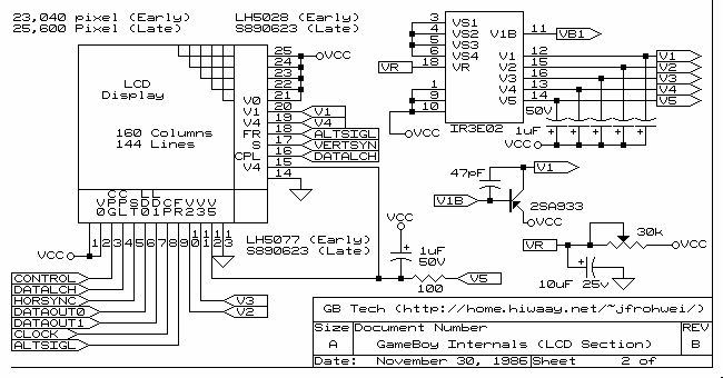 Jaja, ich habe Gameboy falsch geschrieben.... mist. ich habe eine art datenblatt drann gehängt. Da steht einiges drinn, ethält aber keine Datenfluss-Schema. Die Ansteuerung soll ähnlich einem Monitor sein, allerdings mit etwar 9khz horizontaler frequenz statt 15 khz. Diese zwei Digitalen-datenleitungen machen mich stutzig. Andere sind daran ebenfalls gescheitert... Ich habe noch ein paar mehr Schematische Bilder von dem Gameboy. Ich mache noch einen Post um das zweite wichtige noch drannzuhängen.