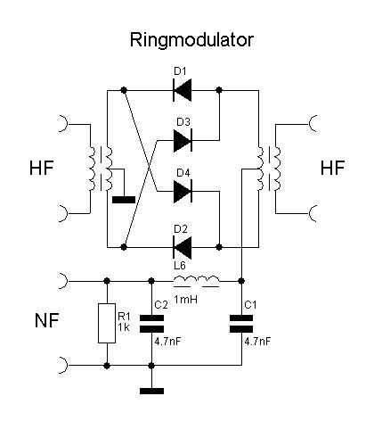 > das Poti im LO-Pfad auch weglassen Ein Dioden-Ringmischer funktioniert am Besten, wenn er auf allen drei Seiten mit 50 Ohm abgeschlossen wird. Der Oszillator sollte also an einem Ausgang mit 50 Ohm Innenwiderstand 7 dBm zur Verfügung stellen, bei 1N4148 dann 10 dBm. Das NF-Signal kann von einem OPV mit nachgeschaltetem 47 oder 51 Ohm Widerstand kommen. Der Spekky hat sowieso einen 50 Ohm Eingang. Die korrekte Funktion des Modulators kann mit Hilfe eines Zweiton-Generators überprüfen werden (Beispiel): http://www.dl2jwl.de/DL2JWL/zweiton.html > weil er viele Oberwellen produziert hatte Da die Dioden vom Oszillator durchgeschaltet werden, wird aus dem Oszillatorsstrom ein abgerundeter Rechteck. Ein Dioden-Ringmischer erzeugt immer Oberwellen, diese werden durch das Seitenbandfilter entfernt. Wichtiger ist ein unterdrückter Träger, dieser sollte auf die Flanke des Filters fallen und wird dort nur um ca. 20dB bedämpft. Zusammen ergibt das trotzdem eine Unterdrückung von ~60dB.