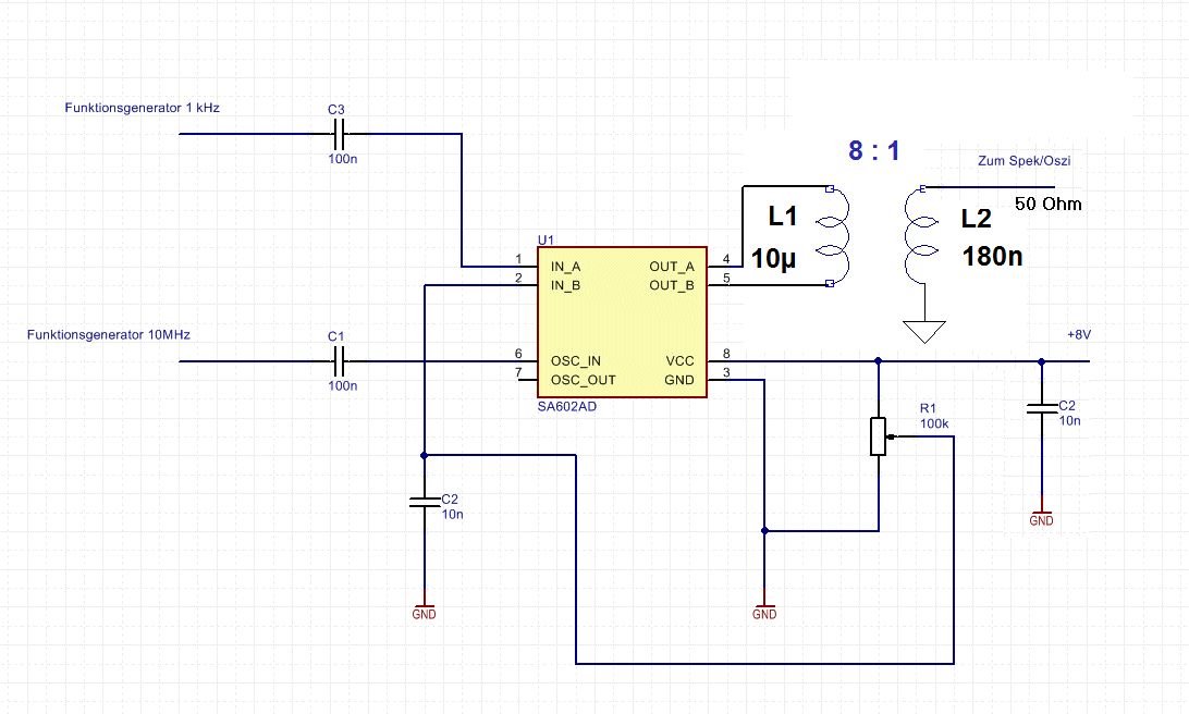 Hallo meinen Versuchsaufbau habe ich wie im Anhang gezeigt zusammengelötet. Grundsätzlich ist es so, dass der Mischer in der Tat mischt: im Spektrum kann ich 10 MHz + 1kHz sehen, sowie 10 MHz - 1 kHz. Es funktioniert also grundsätzlich. Leider schlägt aber mein Träger voll durch. Ich habe schon versucht, eine optimale Einstellung der Amplituden der beiden Funktionsgeneratoren zu finden. Leider ohne Erfolg, den Träger sehe ich immer. Zweitens habe ich auch versucht, die Trägerunterdrückung zu verbessern, indem ich am R1 etwas rum drehe. auch das bewirkt nicht viel, der Träger ist immer da. Was mache ich falsch? Grundsätzlich bin ich nicht abgeneigt, einen anderen IC als den 612 zu verwenden. Ich will es einfach irgendwie schaffen, mein Signal hoch zu mischen. Also meiner Meinung nach brauche ich daher nicht unbedingt eine Gilbertzelle, von mir aus kann es auch ein Diodenring sein, nur sollte es einigermassen gut den Träger unterdrücken. Die Frage ist, wie man das macht. Ich will ein Audiosignal von einem Mikrophon auf 10.7 MHz hoch mischen.