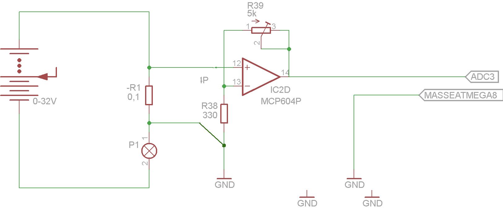 Oh, das habe ich vergessen. Also die Schaltung hat eine Masseverbindung. Damit die Spannung am MCP604 nicht zu groß wird, habe ich ja den 10/1 Spannungsteiler vor den Eingängen vorgesehen, um zu verhindern, das die Spannung dort zu hoch wird. Allerdings teile ich natürlich auch meine Shunt-Spannung mit herunter, was für die Genauigkeit nicht gut ist. Habe mir gerade das AD 8218 B angesehen. Auf den ersten Blink ist es ja genau das was ich Suche. Eingangsspannung kann bis zu 72V sein (Also Diff. zu GND), Versorgen lässt es sich aus 5V und der Ausgang scheint auch bis auf 5mV an Masse gehen zu können. Ich werde mal einen Schaltplan erstellen. http://www.reichelt.de/AD-8218-B/3/index.html?&ACTION=3&LA=446&ARTICLE=113563&artnr=AD+8218+B&SEARCH=AD+8218+B