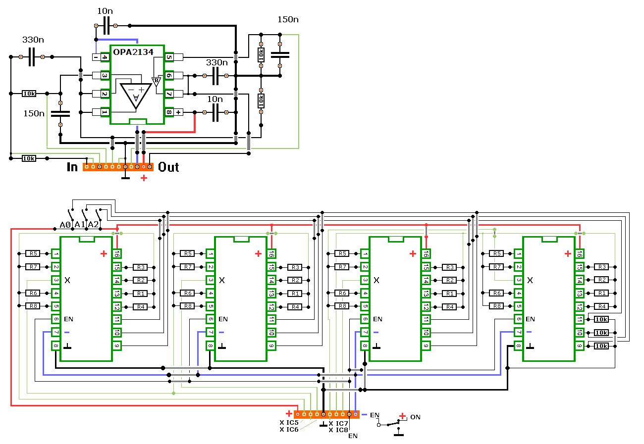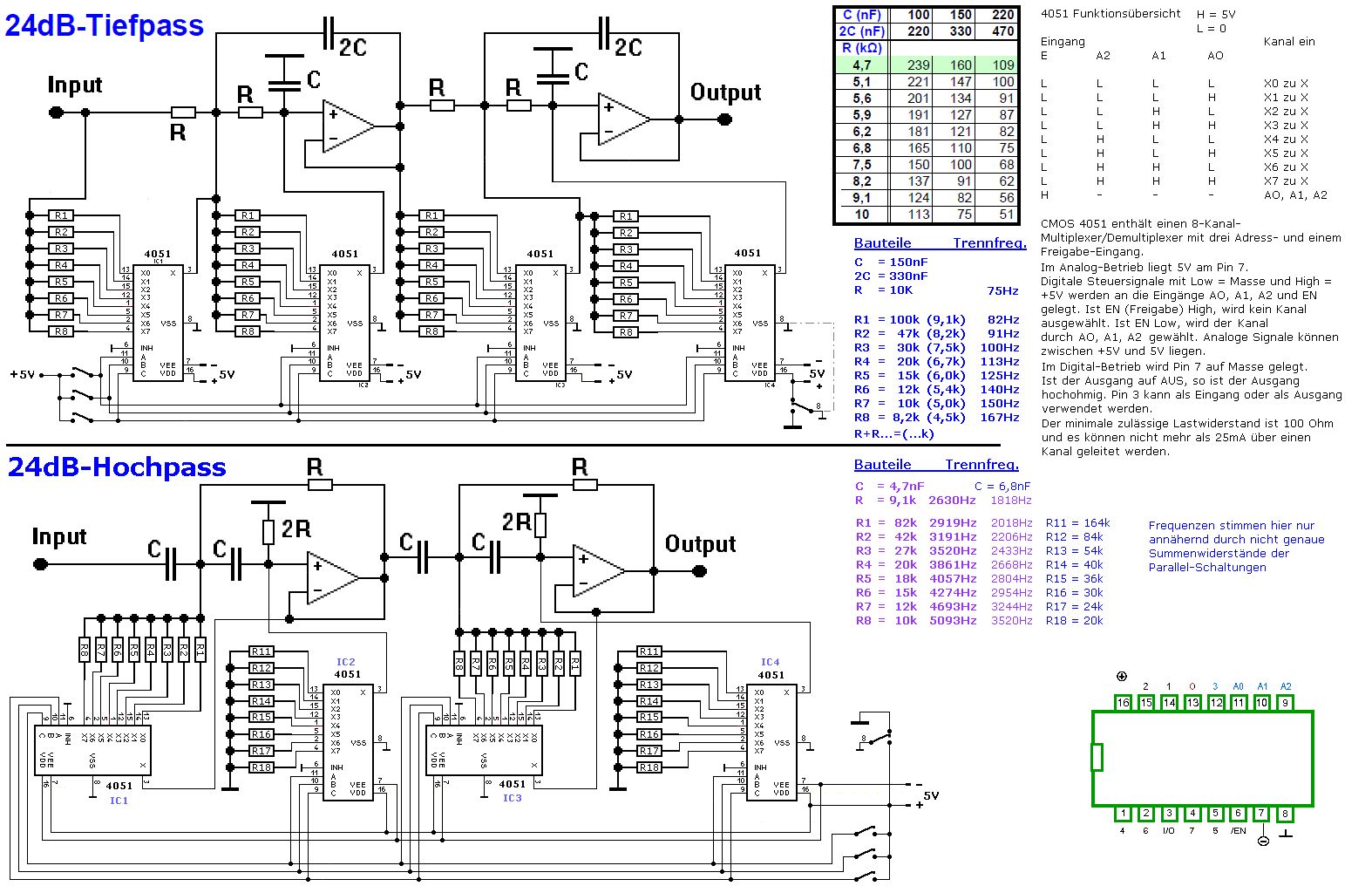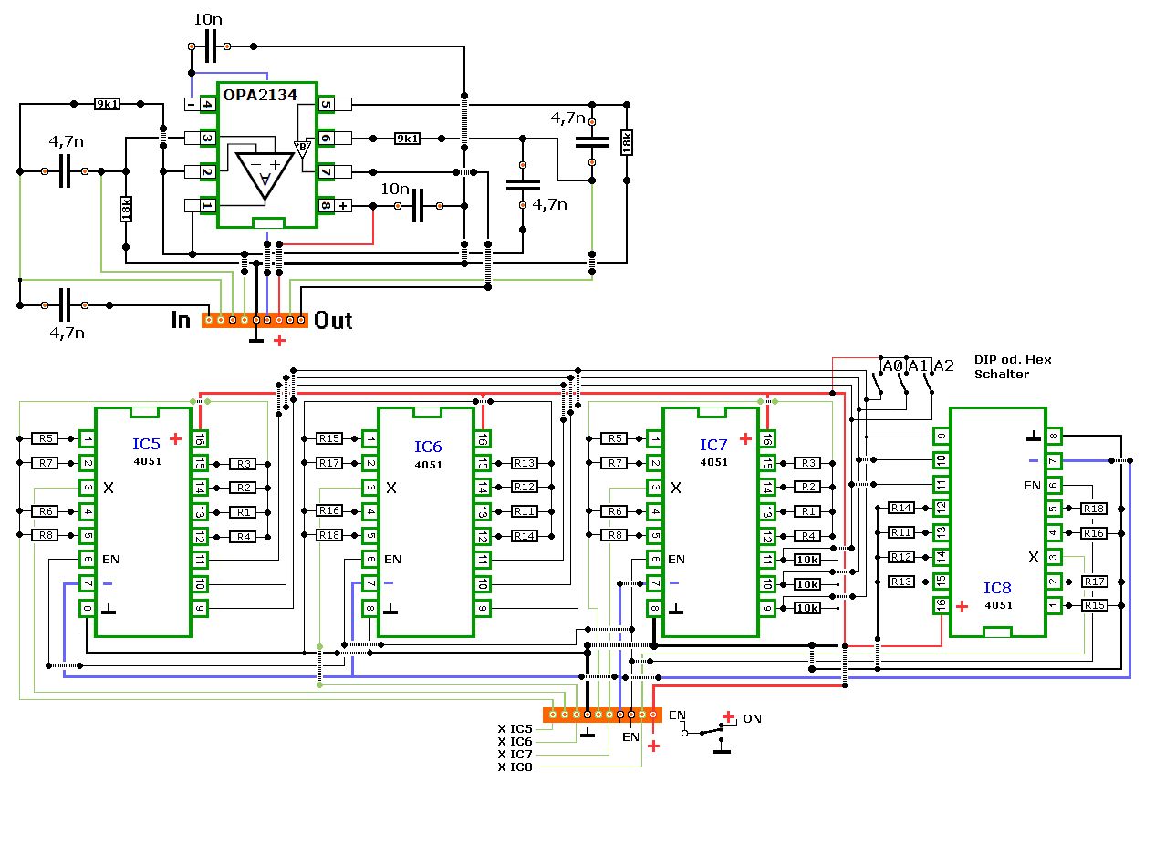 Hallo Anja, Beim Hochpass liegt der Ausgang der Kanäle von IC2 und IC4 über die 2R vom OPV an Masse. Da dürfte kein R an den Ausgang, weil er sonst den R-gesamt und die Frequenz ändert. Sollte bei den anderen ein 10k dran, meinst Du das? Ich habe aber bei der Gelegenheit gleich noch einen anderen Fehler entdeckt. Anschluss 6 (en bzw. INH) muß natürlich gegen Masse oder +5V geschaltet werden und nicht der Anschluss 8 (VSS). Das habe ich gleich nochmal geändert.