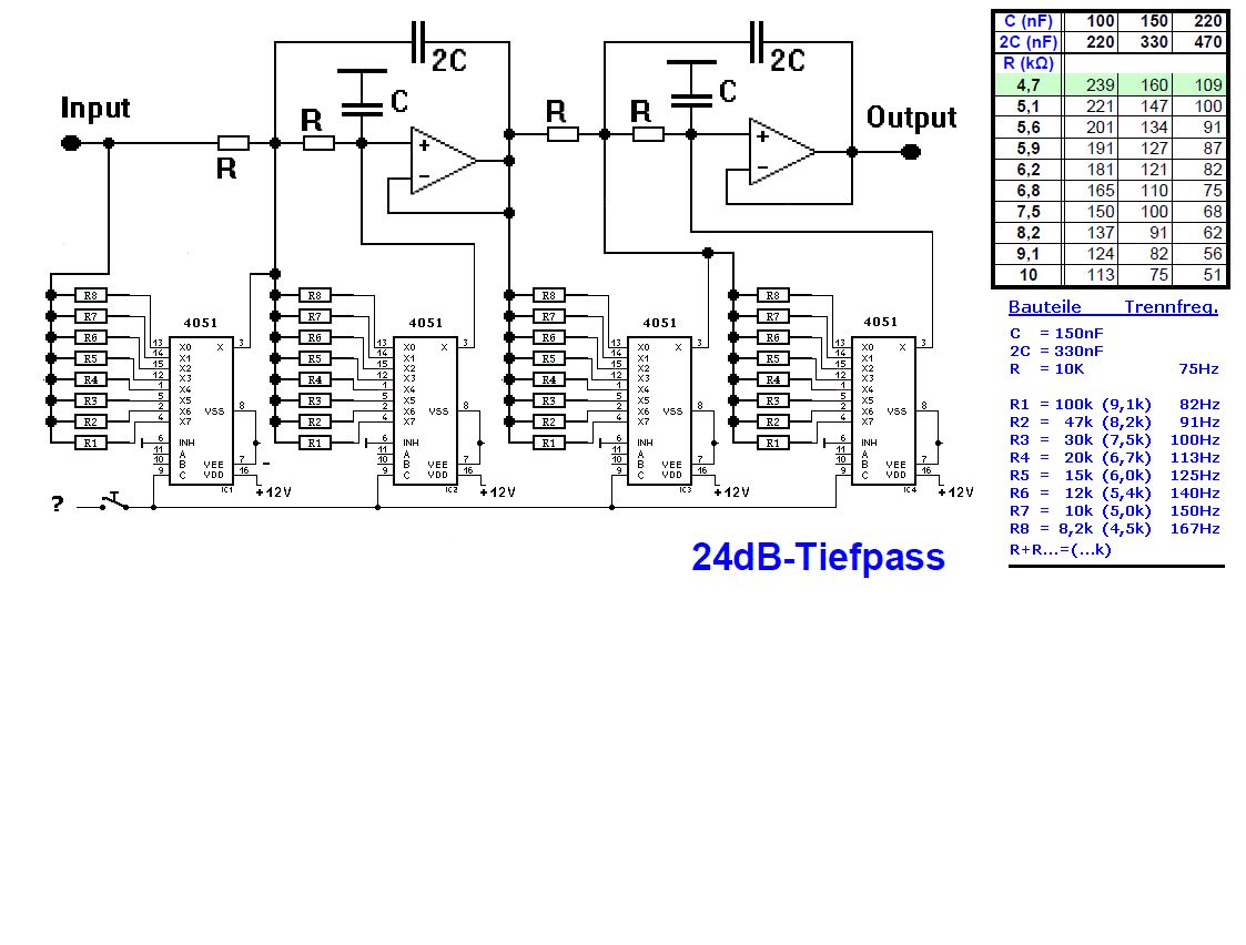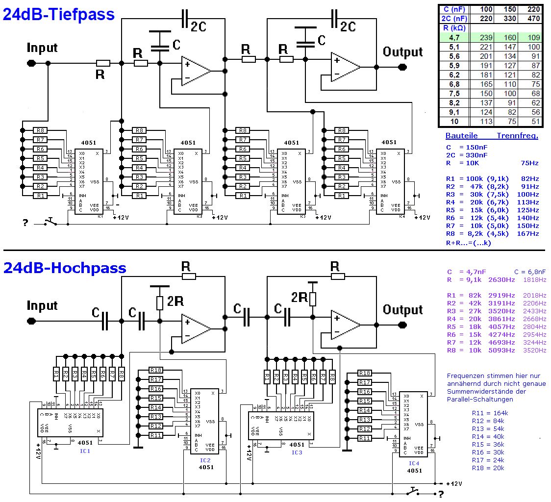 @derguteweka ich würde es besser finden, wenn Du Deine Gedanken dazu mit einem eigenen Schaltbild zu Gesicht bringst. Noch einmal zum Verständnis wozu das Ganze dienen soll, zumindest bei mir. Ich trenne einen Subwoofer (oder Bassbereich) ab und teste per Umschaltung wie er sich in der praktischen Anwendung besser einfügen lässt. Danach werden die Widerstandswerte für die OPV in die eigentliche Aktiv-Weiche übernommen. Ebenso für den Hochpass. Beim Endprodukt mache ich keine Umschaltung. Die Verstärker werden mit den abgetrennten Bereichen gespeist. Sicher fehlt noch der Bandpass, wenn man es genau nimmt. Der muss aber keine 24dB Steilheit haben, und in Stereo ist es am Ende sowieso. @Anja vielen Dank für Deinen wichtigen Tip, den ich in der Zeichnung gelb unterlegt umgesetzt habe. @Matthias Dieser Schalter war mit dem falschen Pin (8) verbunden, was ich schon bemerkt habe. Er schaltet an Pin 6 die 4051 ein oder aus und (bei aus) die in der Weiche vorgegebenen Trennfrequenzen aktiv. Also 75Hz und im Hochpass ca. 1800Hz bzw. 2600Hz je nach dem eingesetzten Kondensator. Hast Du einen Link parat zu den MF10? Das würde mich noch sehr interessieren. Vielen Dank nochmal für die rege konstruktive Beteiligung an Alle.