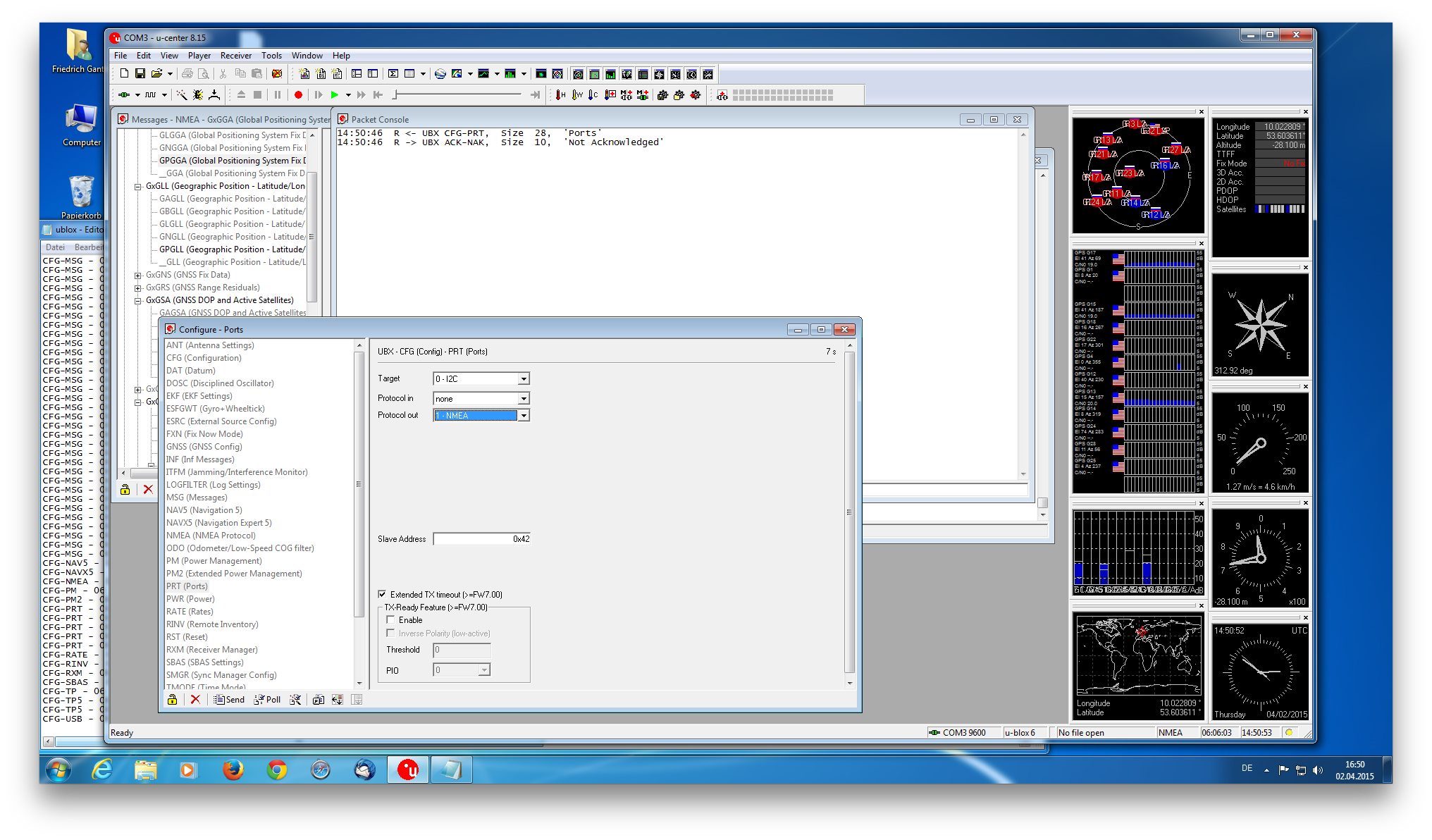 Moin! Ich würde gerne mit einem uBlox-6M Modul über I2C kommunizieren, allerdings bekomme ich keine Nutzdaten raus (Länge 0), was auch klar ist, weil es nicht konfiguriert ist. Das Problem ist, dass ich im u-center kein Protokoll (ublox oder NMEA) einstellen kann, die Einstellung wird mit der Meldung "not acknowledged" nicht übernommen. Kann bitte mal jemand, der ein 6M hat, versuchen diese Einstellung vorzunehmen? IBX/CG/PRT, siehe Screenshot. Bitte die Konfig auch wieder pollen um zu sehen ob sie übernommen wurde. Edit: Die Portadresse und das extended Timeout kann ich einstellen, aber das Protoll muss auf none/none stehen. Vielen Dank!
