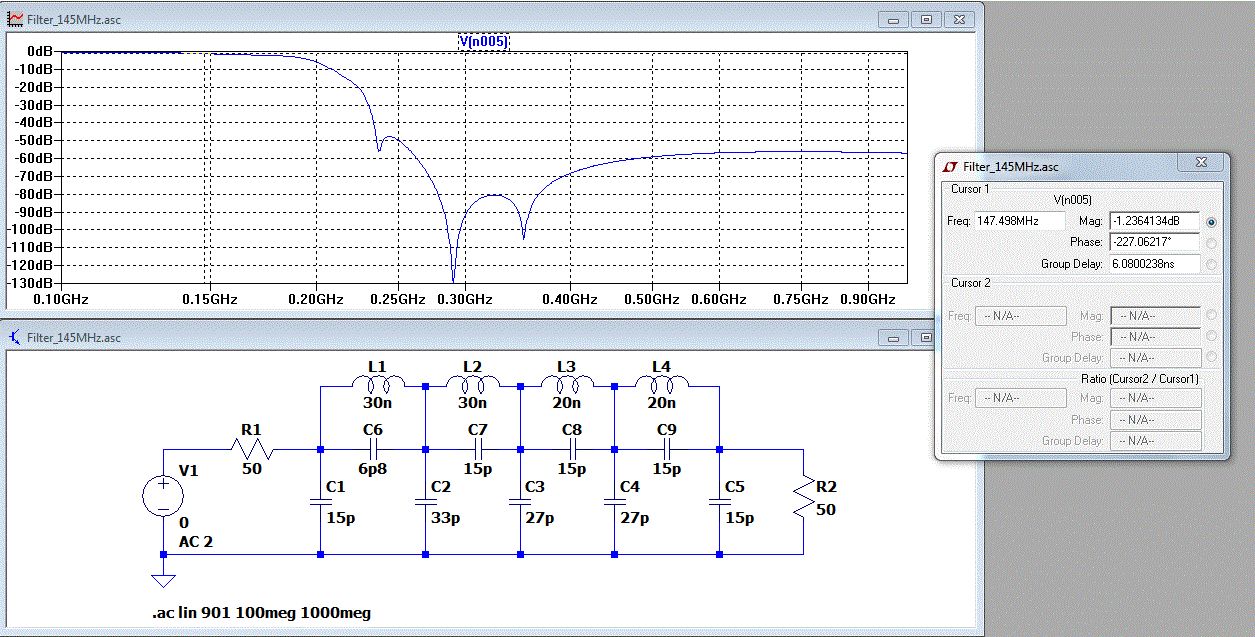 Hallo, ohne Angaben der Induktivitätswerte und der Abschluss-Z's kann man nur herumraten. Ich habe für die L's mal aufgrund der eigentlich unzureichenden Wickeldaten 60nH, 55nH und zweimal 45nH mit Q=100 geschätzt. Die Schaltung ist im Prinzip ein verunglücktes sog. Cauer- bzw. elliptisches Filter. Die Parallel-Cs erzeugen die Dämpfungspole im Sperrbereich. Bei Z=50 Ohm auf beiden Seiten sieht's dann so wie auf dem Bild aus. Horst
