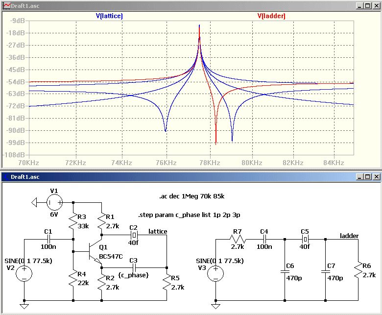 > Durch die Kaskadenschaltung der Quarze und der gegenseitigen Belastung > verschiebt sich die Frequenz nach unten. Das betrifft doch hauptsächlich mehrstufige Ladder-Filter. Wie sieht es dann mit einem aktiven Half-Lattice-Filter aus, ähnlich wie sie bei den alten Spektrum-Analysern verwendet wurden? DCF77 ist mit 77,5 kHz +/- 1kHz definiert. Innerhalb dieser Bandbreite fällt eine Stufe schon um >40dB ab. Und zur Not könnte man auch eine zweite Stufe vorsehen.