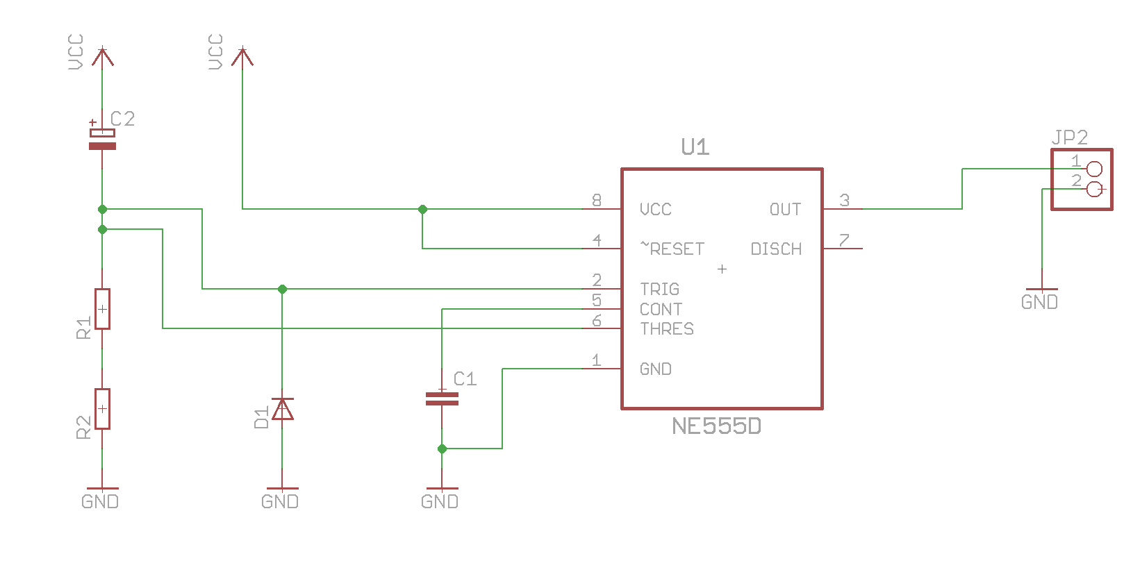 Monoflop, dessen fallende Flanke (nach 500 ms) ein Monoflop triggert, welches einen 500 ms Impuls erzeugt.