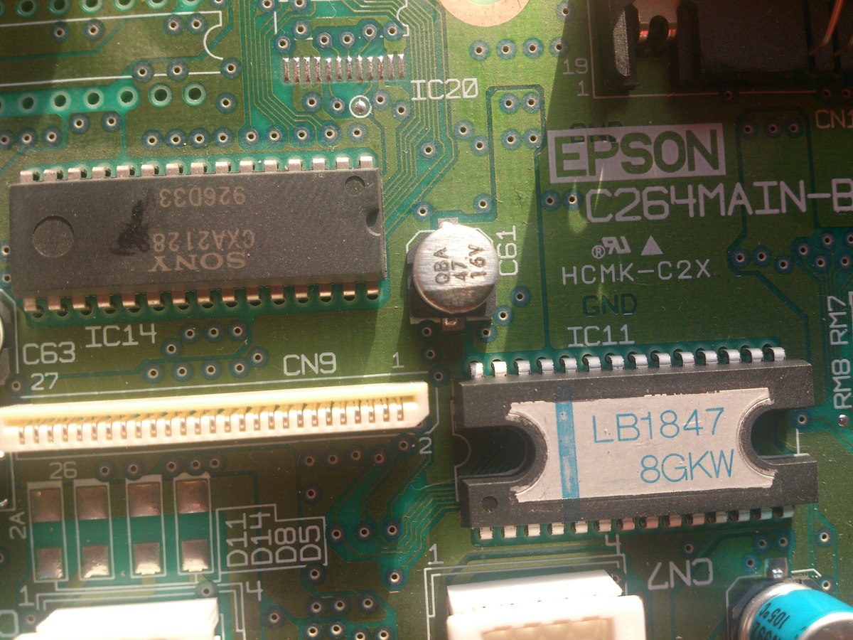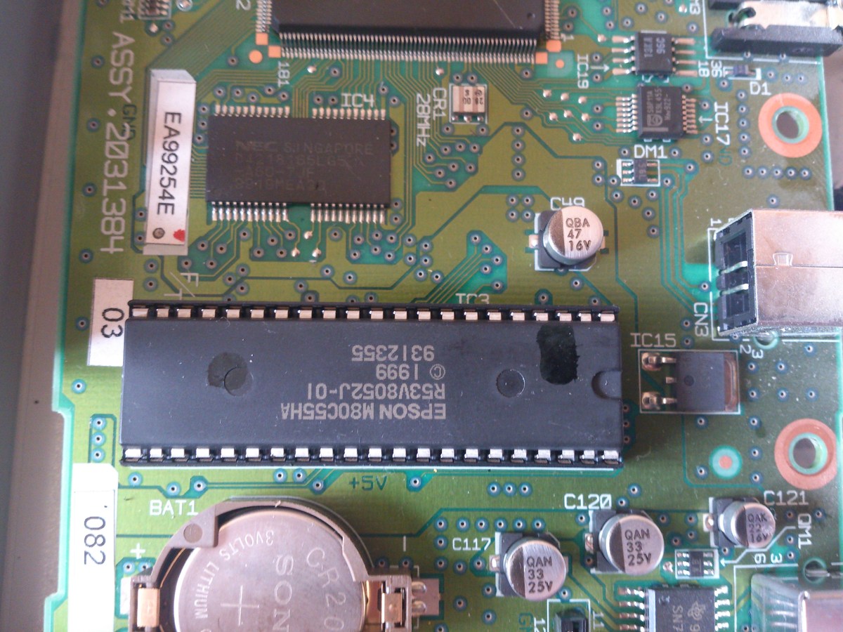 Zählt mal die Pins von IC3. Das ist nicht 40-, sondern 42-polig. Im Schaltplan, der im Servicemanual* zu finden ist, ist das ein 1Mx16-ROM (20 Adress- und 16 Datenleitungen, also 2 MByte). Der CXA2128 scheint eine Alternativbestückung eines CXA2199 zu sein (so jedenfalls ist er im Schaltplan aufgeführt), und das ist ein Treiberbaustein, der irgendwas ansteuert, was am Folienstecker CN9 angeschlossen wird (Druckkopf). *) https://archive.org/download/printermanual-epson-stylus-photo-750-service-manual/epsonstylusphoto750servicemanual.pdf