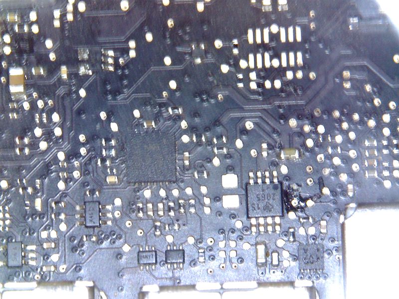 Hallo! hier ich nochmal habe nun hier den Chip für die USB-versorgungspannung siehe Bild gefunden. (15 2065 -1) Da ich nur den Schaltpläne von Macbook Pro aus 2009 finde kann ich nicht klar erkennen ob er es ist. Meiner ist mitte 2011 oder geht das nach Seriennummer. Die Reste von Kolophonium sind nicht von mir im Bild, angeblich wurde das Board schon mal ausgetauscht bei Gravis was ich nicht glaube. Sagte der Vorbesitzer. Wer könnte mir da ein sichern hinweis geben oder helfen. Gruß Sven Ditze