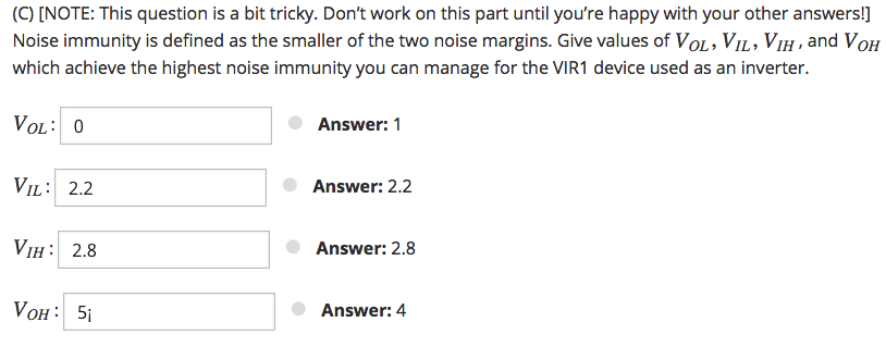 Hallo zusammen, hoffe die Kategorie stimmt, denn ich konnte die Frage nicht wirklich zuordnen. Es geht um die Theorie der "static discipline". Also die Diskretisierung analoger Signale. Die Frage handelt sich um die Lösung einer Aufgabe eines Moocs zur Digitaltechnik. Im Anhang befindet sich die Aufgabe. Wieso lege ich bei dieser Aufgabe mein V_OH auf 4V und mein V_OL auf 1V. Währe 5V bzw. 0V nicht besser? Dadurch wäre die noise immunity um 1 Volt größer. Was definiert mir die obere und untere Grenze? Die inneren Grenzen sind verständlich mit 2.2V und 2.8V, in der Regel würde man 2 und 3 Volt nehmen, aber die Aufgabe verlangt explizit nach der Maximierung der Störsicherheit. Dazu muss die verbotene Zone so gering wie möglich gemacht werden. Um den Inverter möglichst Rauschsicher zu gestalten, müssen die Eingänge möglichst tolerant und die Ausgänge ziemlich stark begrenzt sein. Wenn mein Ausgangssignal auf 5Volt angehoben bzw. 0Volt abgesenkt wird, hätte ich für meine folgenden Bauteile doch die höchste Störsicherheit? Hoffe meine Problematik wurde klar. Danke für die Hilfe. Gruß Al