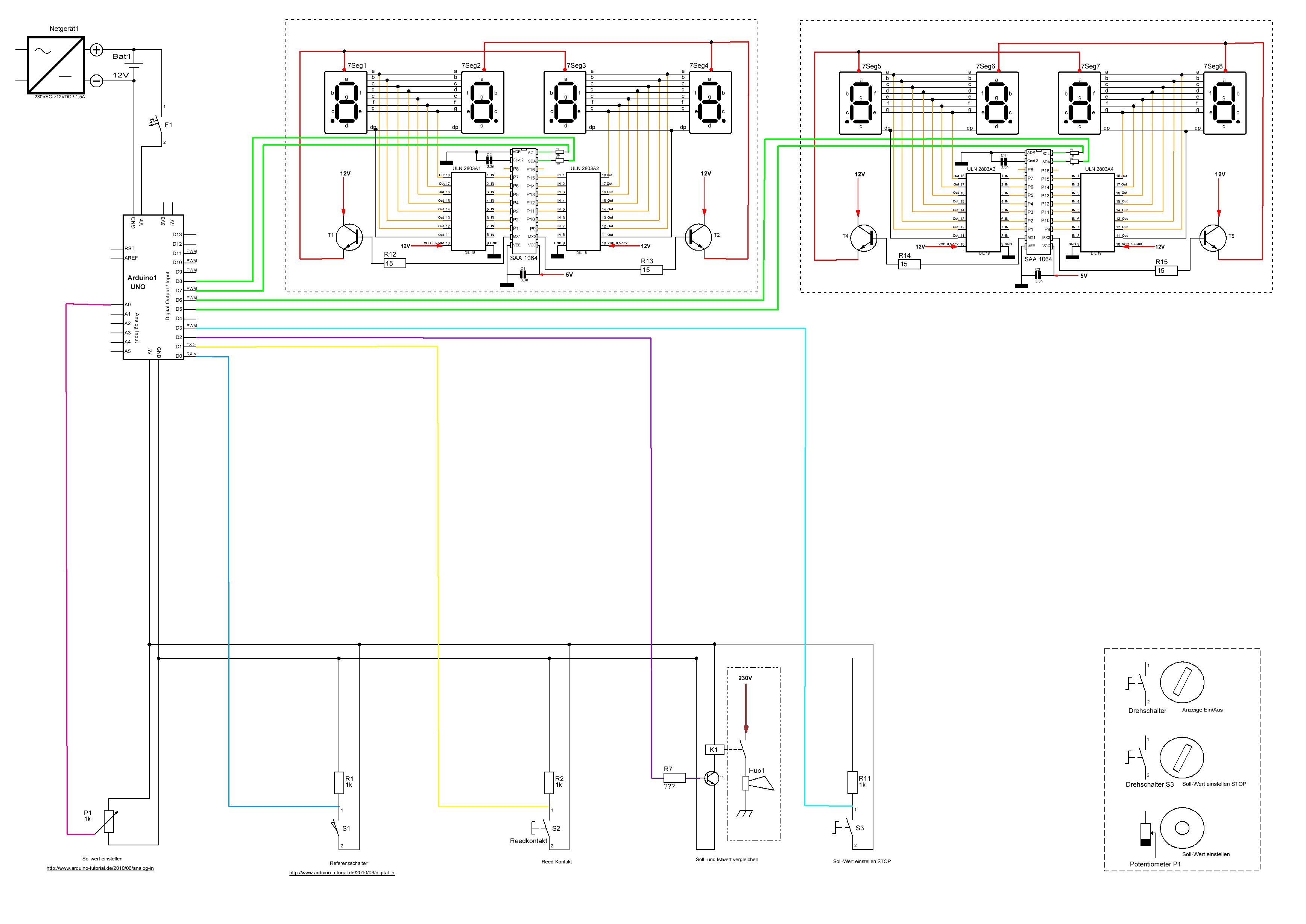 Hey, ich bin im 3 Ausbildungsjahr in meine Lehre zum elektroniker in und für Betirebstechnik. Habe mich schlussendlich entschieden die PAL-Aufgabe zu vermeiden und habe mir zusammen mit meinem Meister ein Projekt ausgedacht und erarbeite mir nun mein betrieblichen Auftrag. Hierzu das Grundsätzliche: Ich will mit Hilfe einer Arduino 2 x 4 Segmentanzeigen ansteuern. Eine 4 x 7 Segmenanzeige soll einen SOLL-Wert anzeigen der über einen Potentiometer von 05,00 Metern - 25,00 Metern eingestellt werden soll. Desweitern gibt es eine Anzeige die den IST-Wert dartellen soll quasi den tatsächlichen gefahrenen Wert. Ein Sensor bekommt alle 10cm impulse und gibt diesen an die Anzeige weiter. Also pro Impuls 00,10m zählen. Das wars im groben und es funktioniert auch alles in meinen Test mit kleinen Anzeigen. Im anhang findet ihr Pläne und weiteres. PS: Zum großen Schaltplan, ja ich weiß die vorwiderstände für die Segmentanzeigen fehlen sind aber in Wirklichkeit da. nun Frage ich mich warum mir ständig der ULN 2803a abraucht. Ich hoffe die Pläne sind verständlich. Vielen Danke und viele Grüße Lukas
