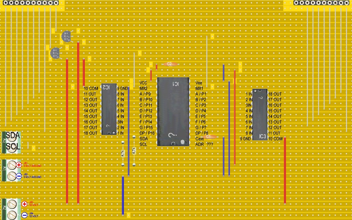 SDA und SCL vertragen maximal 5.5V als Eingang. Da Du nur 12V hast, mußt Du Dich mal über Pegelwandler informieren. Und zeig mal einen neuen, fehlerfreien Plan. Im alten waren nämlich 2 Kurzschlüsse.