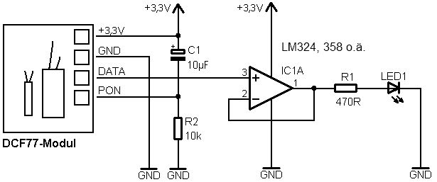 Ja und was macht der OPV nach Redemann? Er dient als Impedanzwandler und Spannungsfolger.Was machen der 10µ Elko und der 10K Widerstand ? Sie geben dem PON- Eingang einen negativen Puls beim Einschalten und Sorgen für ein schnelles Starten des DCF77-Moduls = kleiner 60 sek.Nix mit 5 und mehr Minuten wie beim Funkwecker von Aldi und co.Einfach die Schaltung mal aufbauen und Testen und erst anschließend Meckern wenn der Start 65 sek gedauert hat!