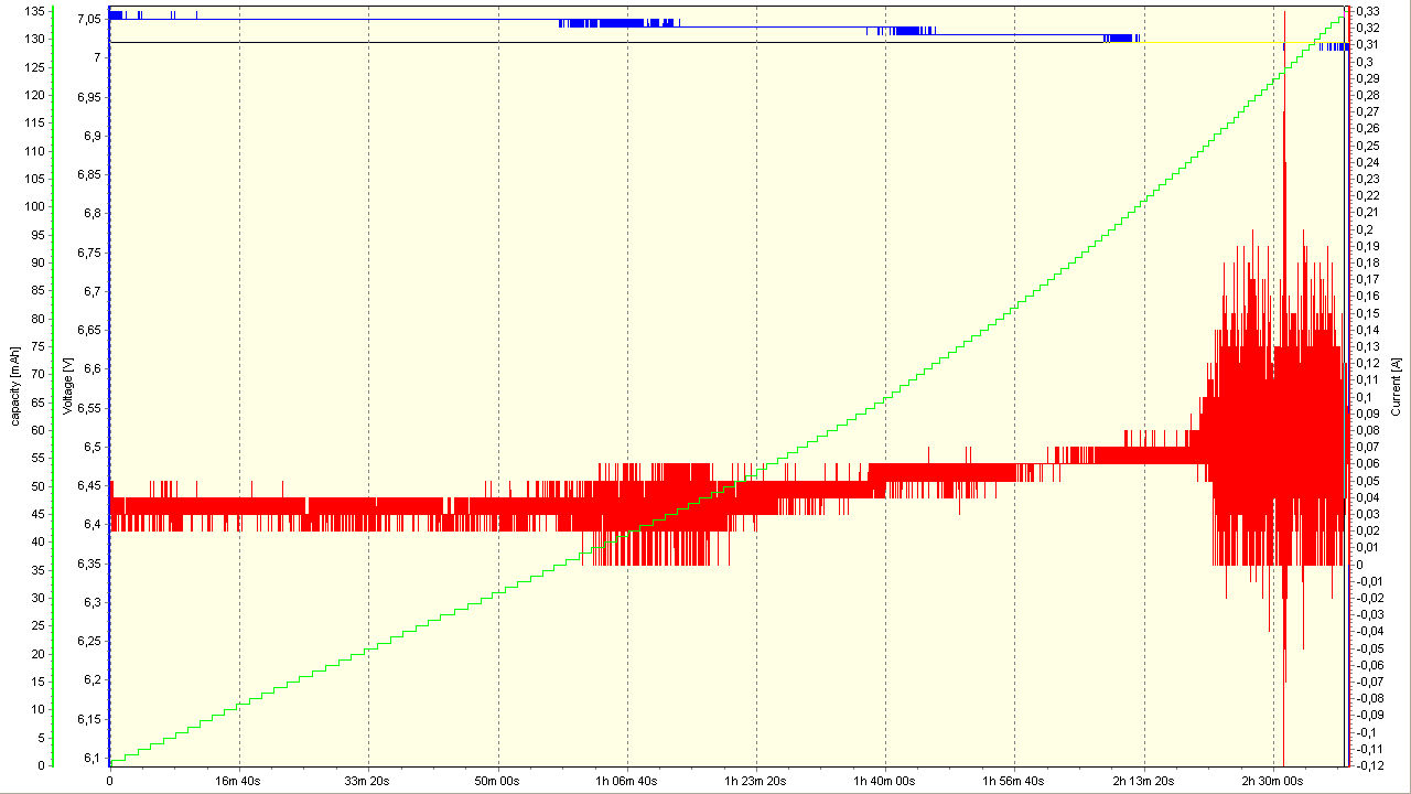 Da ist mir was seltsames untergekommen. Mit einem Ladegerät für Siemens Schnurlos-Telefone ( S6 oder E10 ) dem FW 7220 ( 6,5VDC/700mA ) hatte jemand tatsächlich einen 6V/12Ah Bleiakku geladen. Der Spannungsverlauf sieht gut aus ( 7,05V fast konstant => 3x 2,35V ). Der Strom mit seinen 30mA bis 60mA ist etwas mickrig, aber der Akku war halt defekt und nahm kein Strom mehr an. Gegen Ende spinnt der Strom und dann ist das Ladegrät defekt. Bernd_Stein
