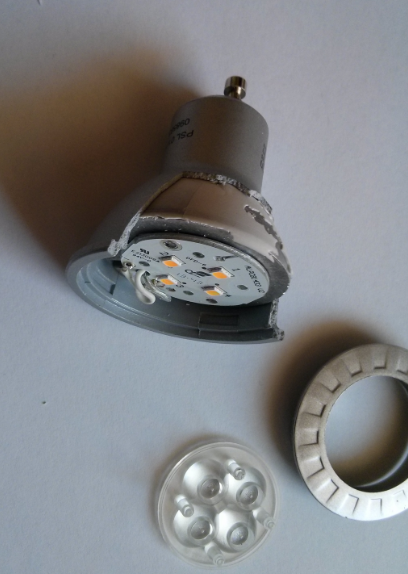 Sieht aus wie eine Paulmann-LED. Davon habe ich zwei Stück in der Lampenmüllkiste gefunden. Hergestellt 01/14. Weggeworfen 11/15. Eingelegt in Packungen des Nachfolgemodells, Aufdruck "20000 Stunden." Man sollte den Rechenlegasthenikern von Paulmann vielleicht mal sagen, daß 20000 Stunden länger als 22 Monate sind. Nämlich 833 Tage. Der Käufer hat aber auch nichts gelernt: 1. die Gewährleistung nicht in Anspruch genommen, 2. nochmal denselben Schrott gekauft. Die LED tun übrigens. Müßte der Spannung nach 4x Doppel-LED sein, sie leuchten ab 20, 22 V herum. Die Platine ist augenscheinlich und geruchlich in Ordnung, ich tippe auf Halbleitertod.