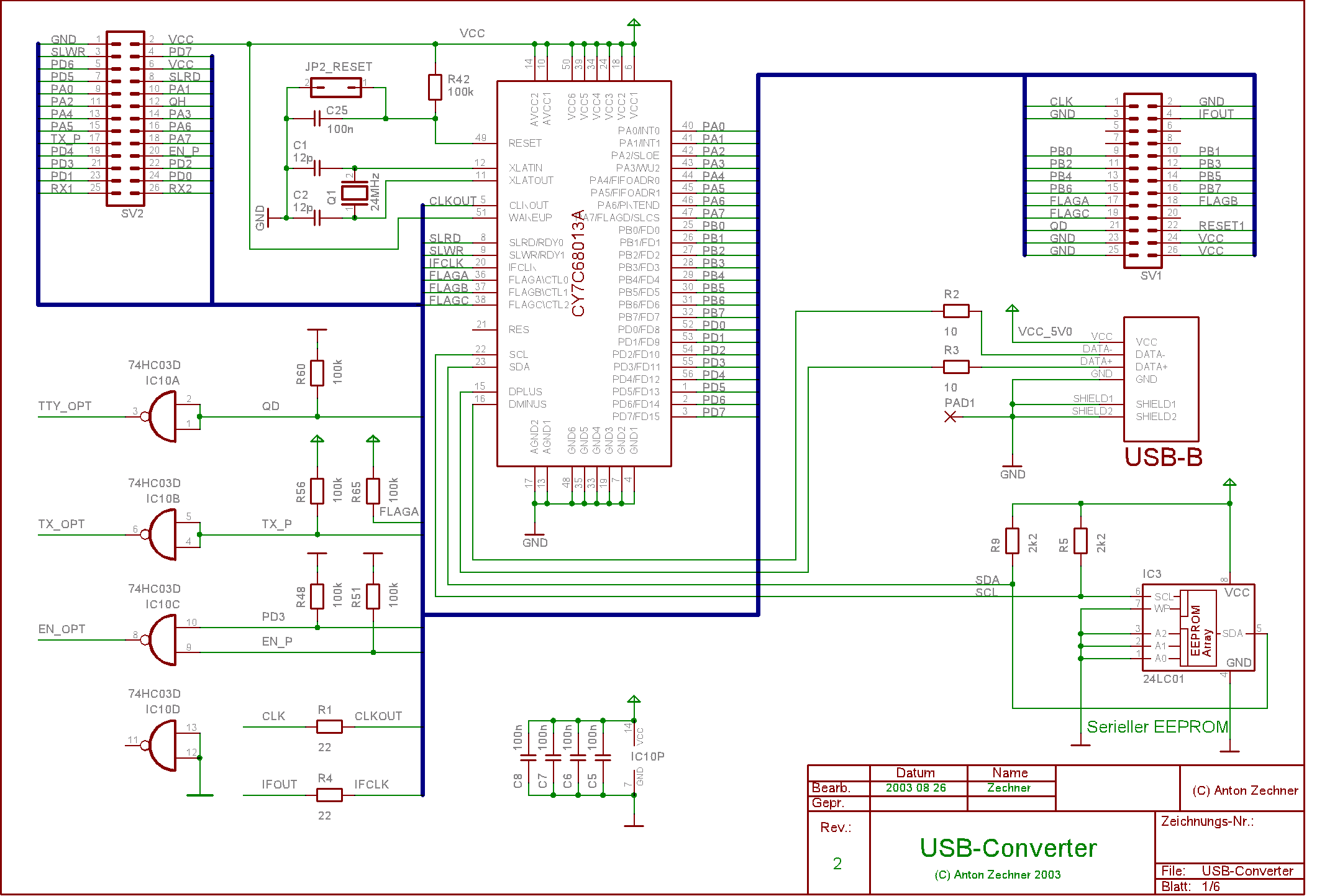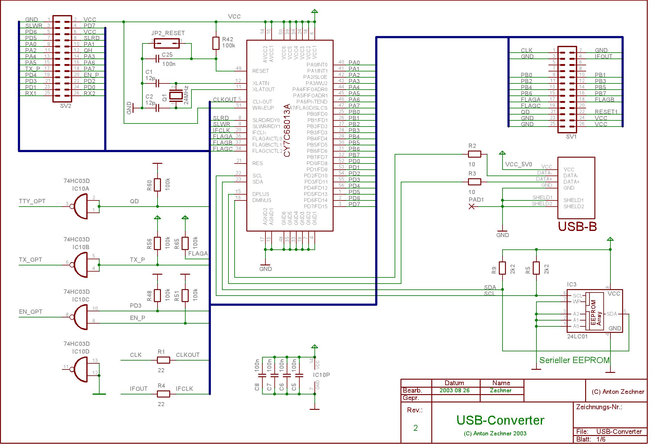 Ich habe mir eine Schaltung mit einem CY7C68013A zusammen gebaut: Hier ist der Schaltplan: http://members.inode.at/anton.zechner/FXPL-Schematic.gif Die CPU startet scheibbar nicht. CLKOUT ist immer auf 3.3V . Am Quarz messe ich ein 150 mV/24MHz Signal (Spitze-Spitze). Wenn ich das Gerät anstecke wird nach einem USB-Gerät gesucht. Es wird aber nichts vernünftiges gefunden. Mein USB-Monitor zeigt immer ein Gerät mit DEVICE_ID=0000 und VENDOR_ID=0000 an. Mache ich einen Reset am CY7C68013A verschwindet das 0000/0000 USB-Device. Es kommt wieder wenn ich den Reset aufhebe. Den EEPROM habe ich noch nicht eingelötet. Da CLKOUT immer auf high ist vermute ich das der Oszilator nicht an läuft. Weis jemand von euch was die Ursache dafür sein kann ?