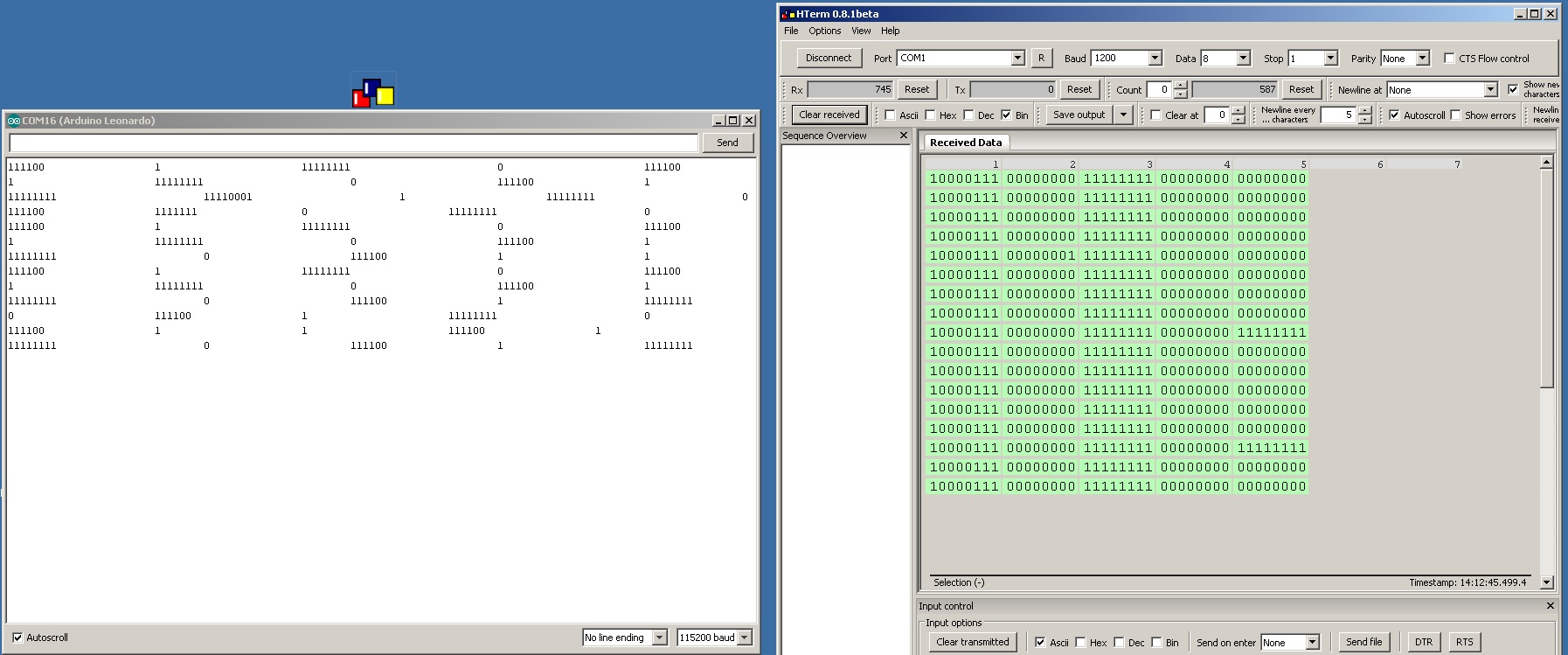 Hallo. Ich trete hier etwas auf der Stelle. Ich möchte Daten von einem recht alten Trackball mit einem Arduino verwerten. Der Trackball liefert serielle daten mit 1200baud (8N1). 5byte mouse protokoll. Anschlüsse hat der nur V+, GND und TX. Am com1 port von PC läuft das fein (siehe bild rechts). Am arduino und an einem prolific usb seriell wandler erhalte ich aber nicht die selben daten (siehe bild links). In dem Beispiel empfangen beide schnittstellen die selben Daten (Problem tritt aber auch mit dem Arduino alleine Auf). Meine üblichen Probleme (Baudrate falsch, GND nicht verbunden, falscher quarz am uc) habe ich schon durch ausgeschlossen. Der code auf dem arduino liest den Empfangspuffer und schreibt die ersten 5 bytes in ein array, das dann über den virtuellen com Port an den PC geschickt wird. Das Problem habe ich aber auch mit dem Prolific usb seriell wandler. Kann es sein dass einzelne bits verpasst werden und sich dadurch andere bytes ergeben?