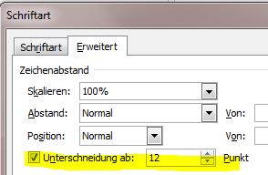 Dave Anadyr schrieb: > Also...mit anderen Worten: egal ob Kerning ein oder aus ist, bei 160% > Zoom sind die Abstände in dem Wort richtig Das Kerning oder deutsch: Unterschneidung, wirkt sich erst bei einer bestimmten Schriftgröße aus. Bei MS Word gibt man die Schriftgröße an, ab die Unterschneidung aktiv werden soll. http://de.wikipedia.org/wiki/Unterschneidung_%28Typografie%29