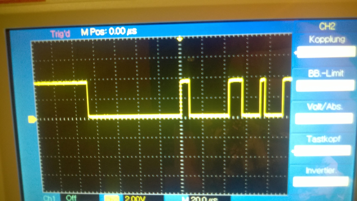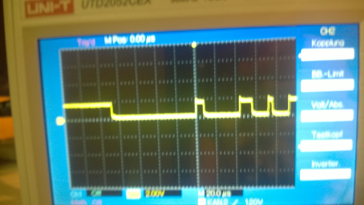 Hallo zusammen! Ich habe mir vor längerer Zeit mal den DMX Transceiver von Henne (http://www.hoelscher-hi.de/hendrik/light/dmxled.htm) zusammengebaut. Nun hab ich endlich die Gelegenheit mir ein DMX Pult auszuleihen(Behringer Eurolight). Nach einigen Fehlerbehebungen im Anschluss mit dem DMX Bus ging er dann gestern auch, jedoch hatte er kleine Aussetzer beim Ändern von Werten. Deswegen wollte ich ihn heute noch einmal überarbeiten und habe auch alle Lötstellen die schlecht aussahen nochmal verbessert, wobei mir aufgefallen ist, dass ich beim 75176B VCC gar nicht angeschlossen hatte (Schande über mich). Nachdem ich dann alles korrigiert hatte und eigentlich Richtig angeschlossen habe probierte ich es erneut und jetzt geht gar nichts mehr :/ Die Error LED blinkt kontinuierlich -> Kein DMX Signal gefunden. Also hab ich mal den Oszi drangehängt und das DMX Signal ist sauber vorhanden(Bild2). Zumindest wenn der Transciever mit Strom versorgt wurde. Ansonsten wird das DMX Signal stark verzerrt(Bild1). Bevor ich VCC am 75176B angeschlossen hatte, war es genau anderrum -> ohne Stromversorgung Sauber und mit Verzerrt. Eine andere Fehlerquelle auser im Bereich zwischen DMX Bus und Atmega8515 ist ja eigentlich ausgeschlossen oder? Habe ich vllt. den 75176B gegrillt? Kann ich den irgendwie durchmessen? Bin für jede Hilfe dankbar :) Gruß Thomas