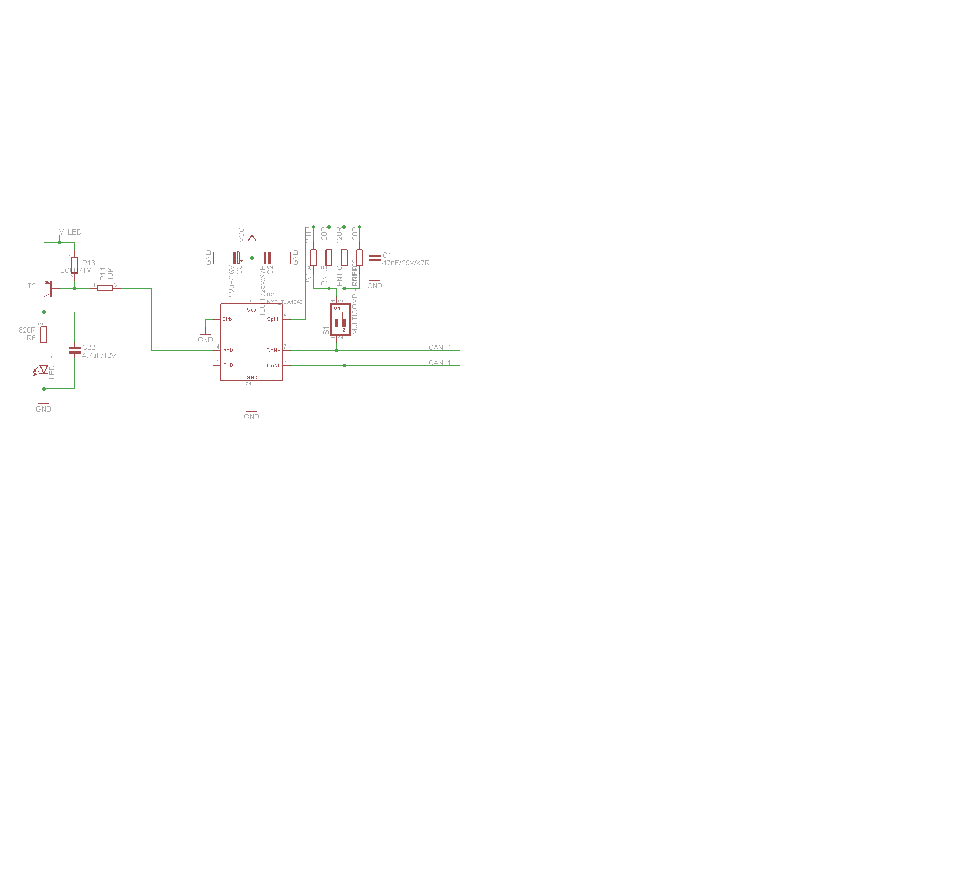 Klaus schrieb: > dunno.. schrieb: >> Ich hab zwar mit PICs nichts zu tun, an anderen Microcontrollern sind >> die Pinfunktionen wohl in der Regel exklusiv.. Beide funktionen >> gleichzeitig nutzen zu können, würde mich wundern.. > > INT3 ist doch nur ein Input, warum soll das nicht gehen? Den UART TX Pin > des µCs kann ich doch auch direkt einlesen (geht zumindestens mit den > PICs, die ich benutze so). Outputs müssen natürlich exklusiv sein. > > MfG Klaus Beim ARM (7) stelle ich über pinsel ein, welche funktion den pin exklusiv nutzt, gpio geht dann nimmer (zumindest verstehe ich das datasheet so, habe nie probiert was passiert..) Ich würde überlegen was ich will: Aktivität der Node darstellen: CAN-RX interrupt als quelle. Aktivität am Bus anzeigen: Led mit Transistor von CAN-RX des Transceivers ansteuern lassen. Um das Blinken besser sichtbar zu machen, nen kleinen kondensator parallel zur LED. So wie im Anhang habe ich das mal gebaut..