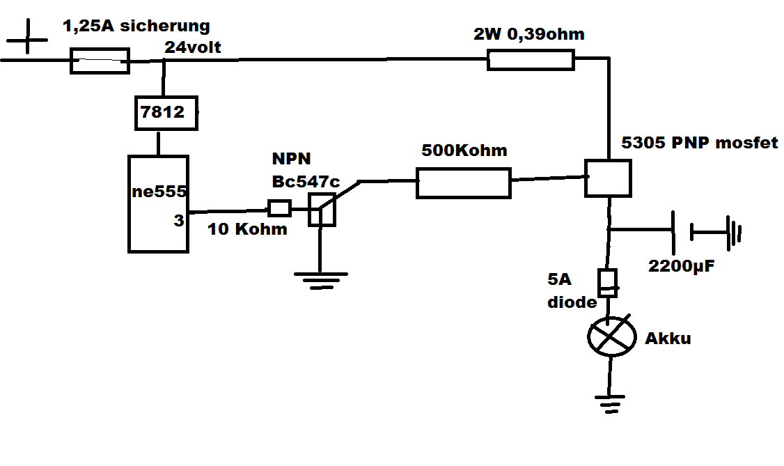 Ein paar Anmerkungen: Nimm Stift und Papier, wenn du mit dem PC keinen vernünftigen Schaltplan hinkriegst. "PnP mosfet" nennt man P-Kanal Mosfets Mit deiner Schaltung wird der FET nie sperren, da die Ladung aus dem Gate nicht abfließen kann, mach einen Widerstand zwischen Gate und Source Über den 500k wirst du keine Spannung einstellen, der beeinflusst nur wie schnell das Gate Geladen wird. Wenn mit "5305 PNP mosfet" der IRF5305 gemeint ist: Keine gute Idee, der wird bei |Vgs| > 20V kaputt.